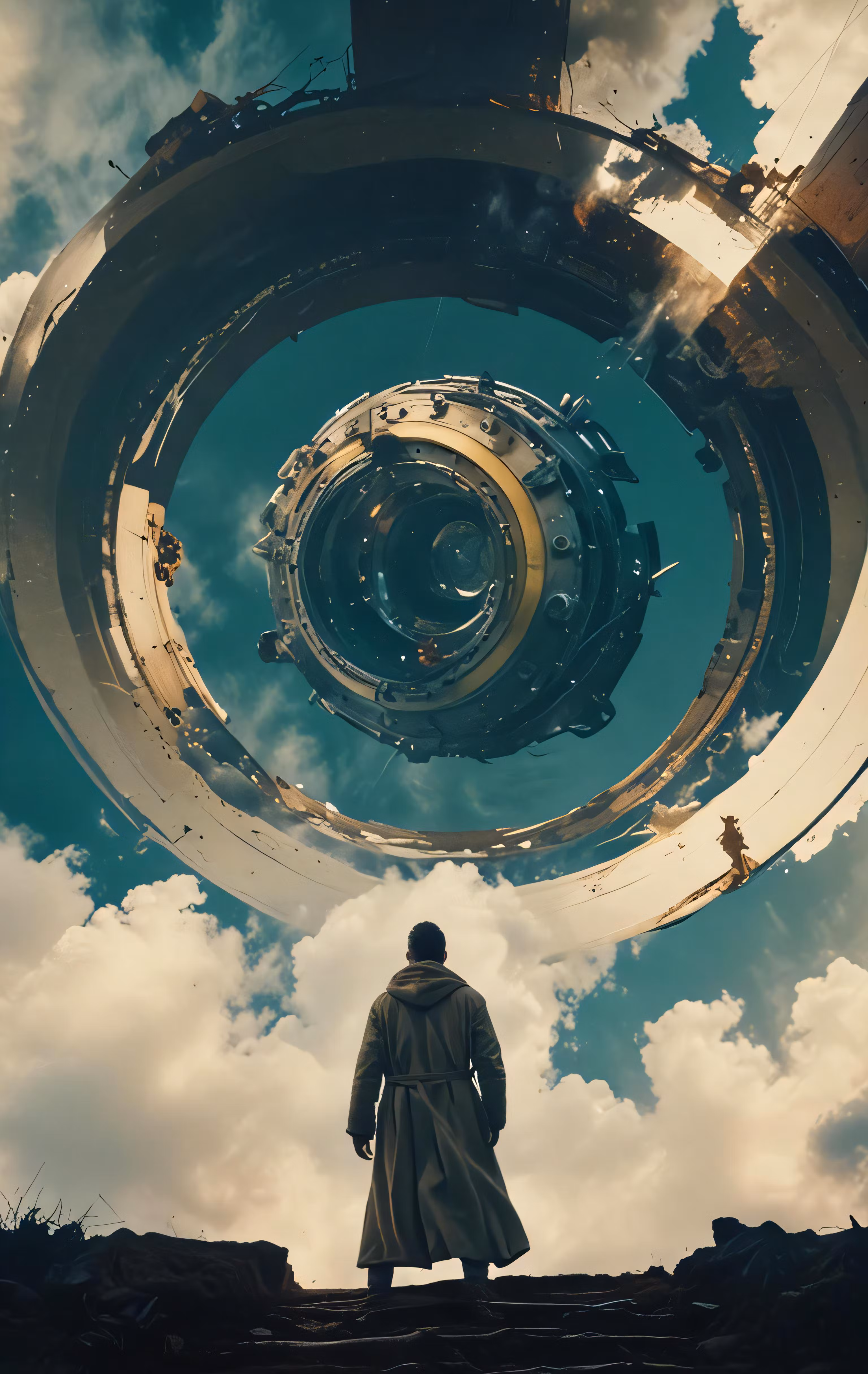 High resolution picture, free to use, a man standing on a ledge looking at a large object