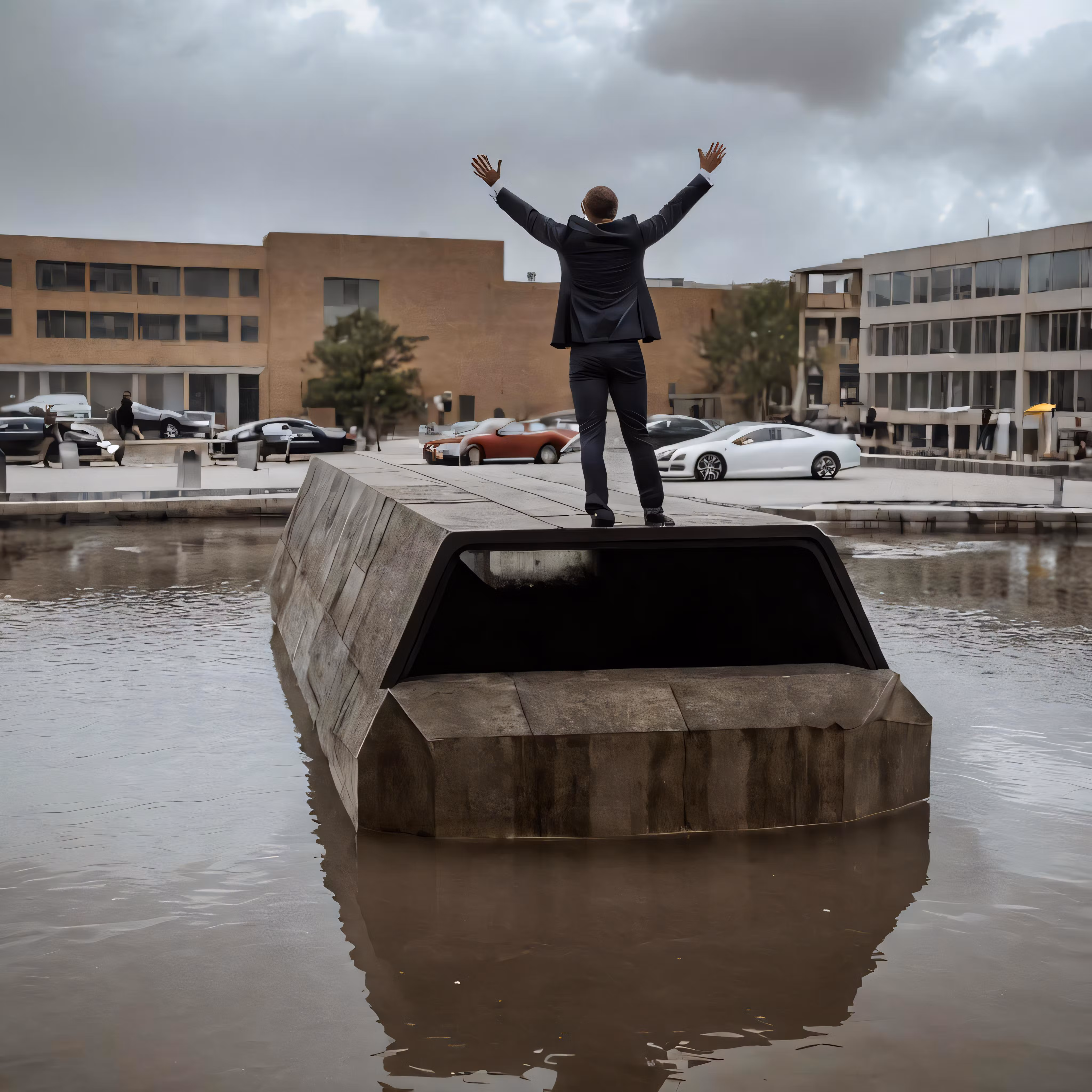 High resolution picture, free to use, a man standing on a square object in the middle of water