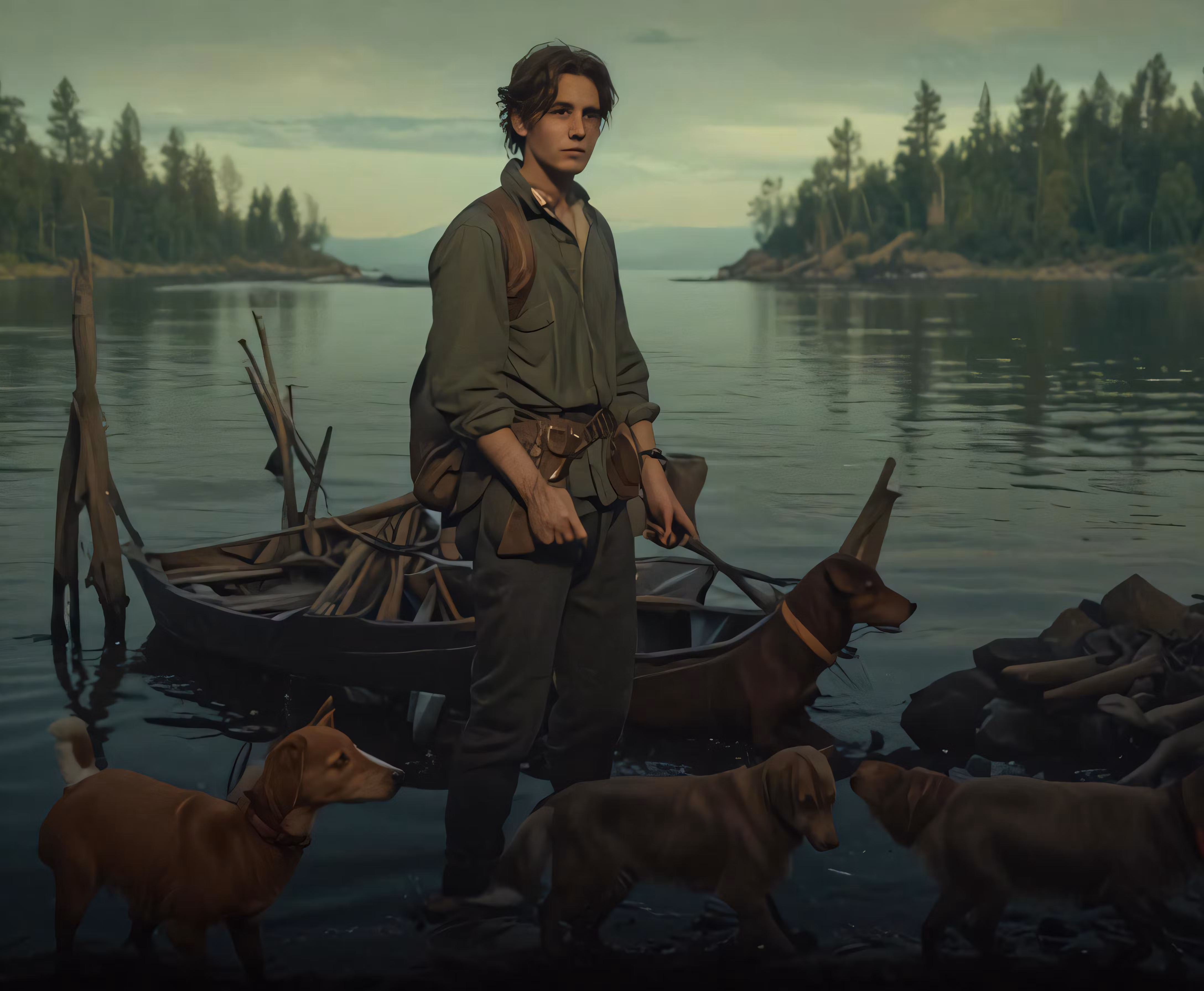 High resolution picture, free to use, a man standing on the boat in a lake, while four dogs surround him