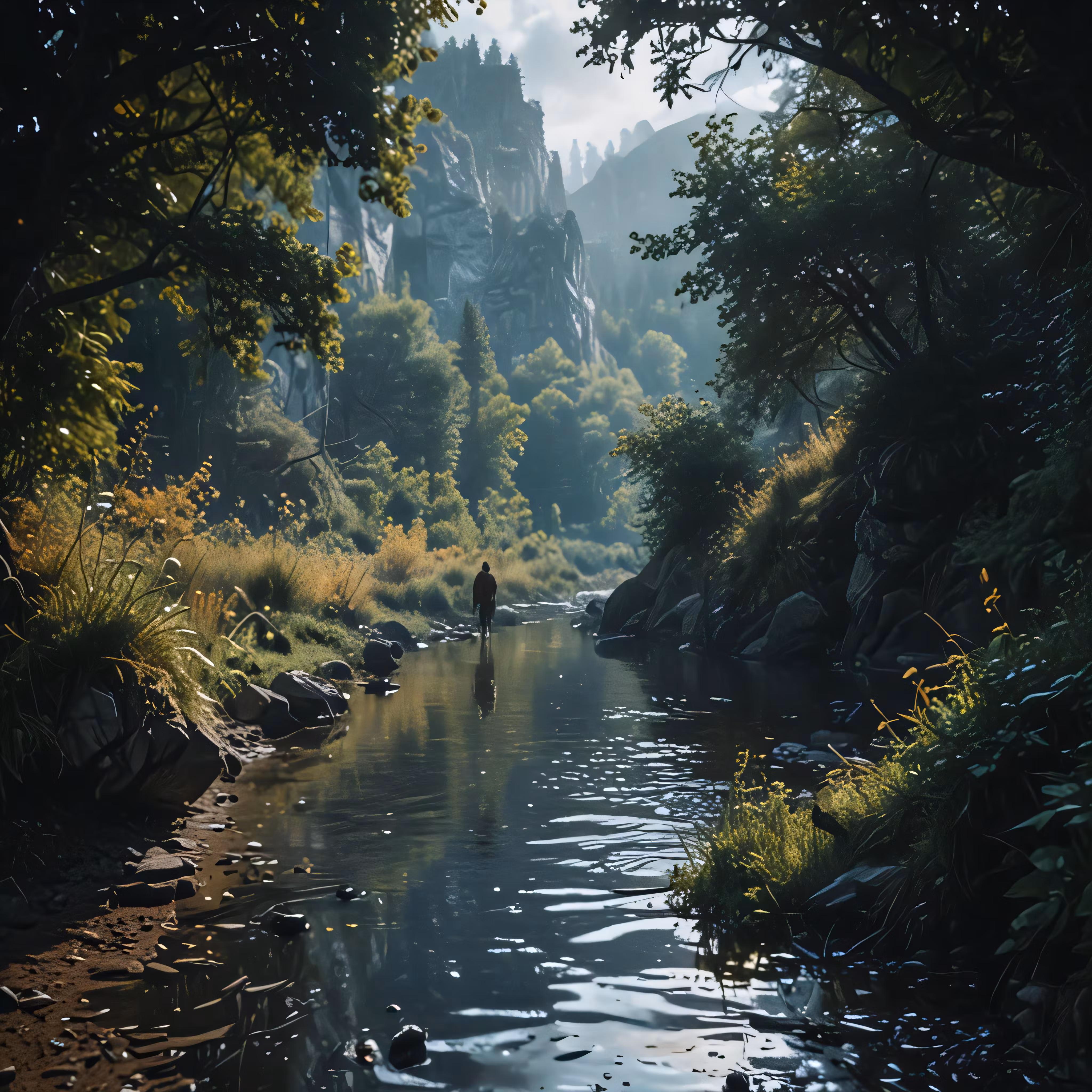 High resolution picture, free to use, a man standing on top of a river near a forest