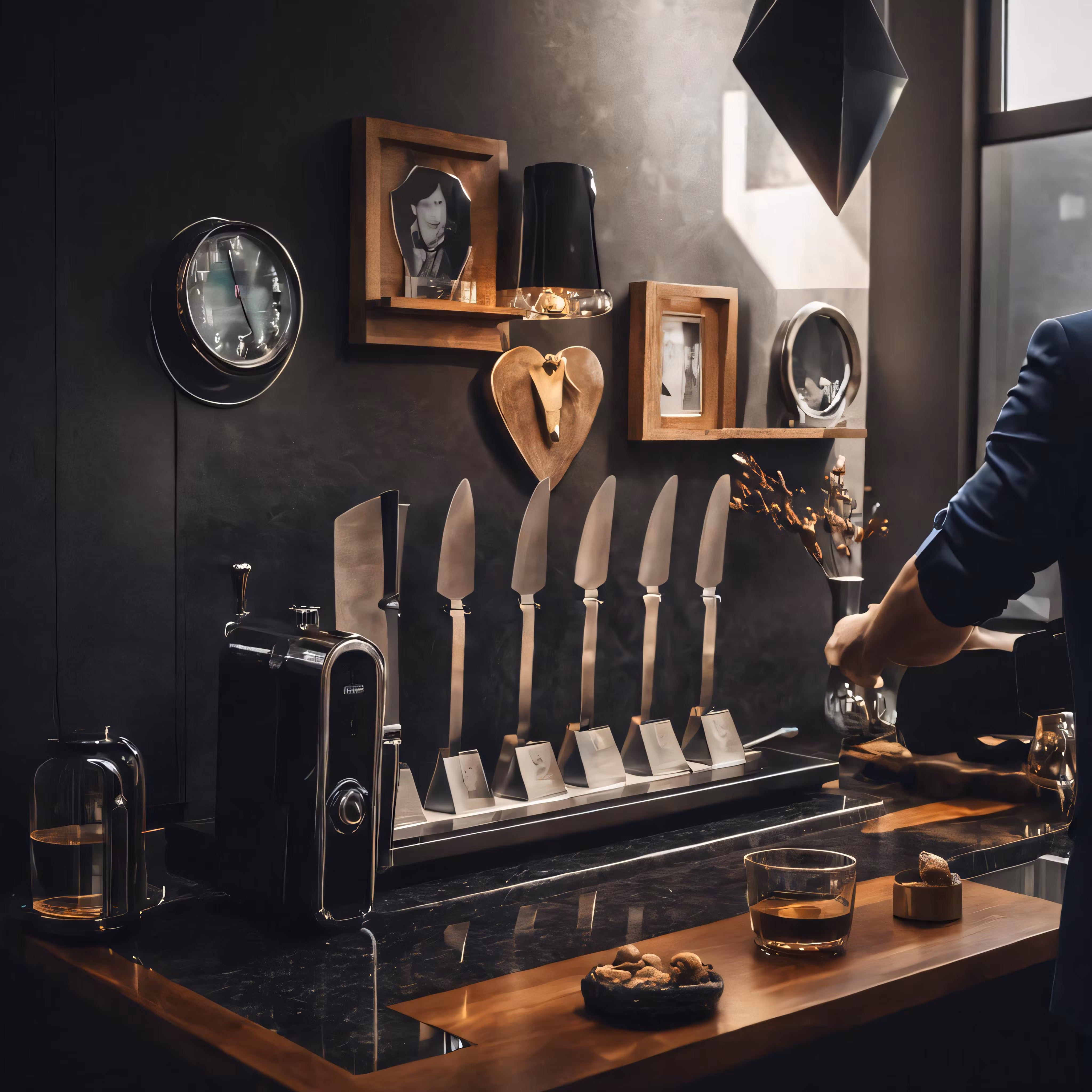 High resolution picture, free to use, a man stands by a coffee table filled with different items
