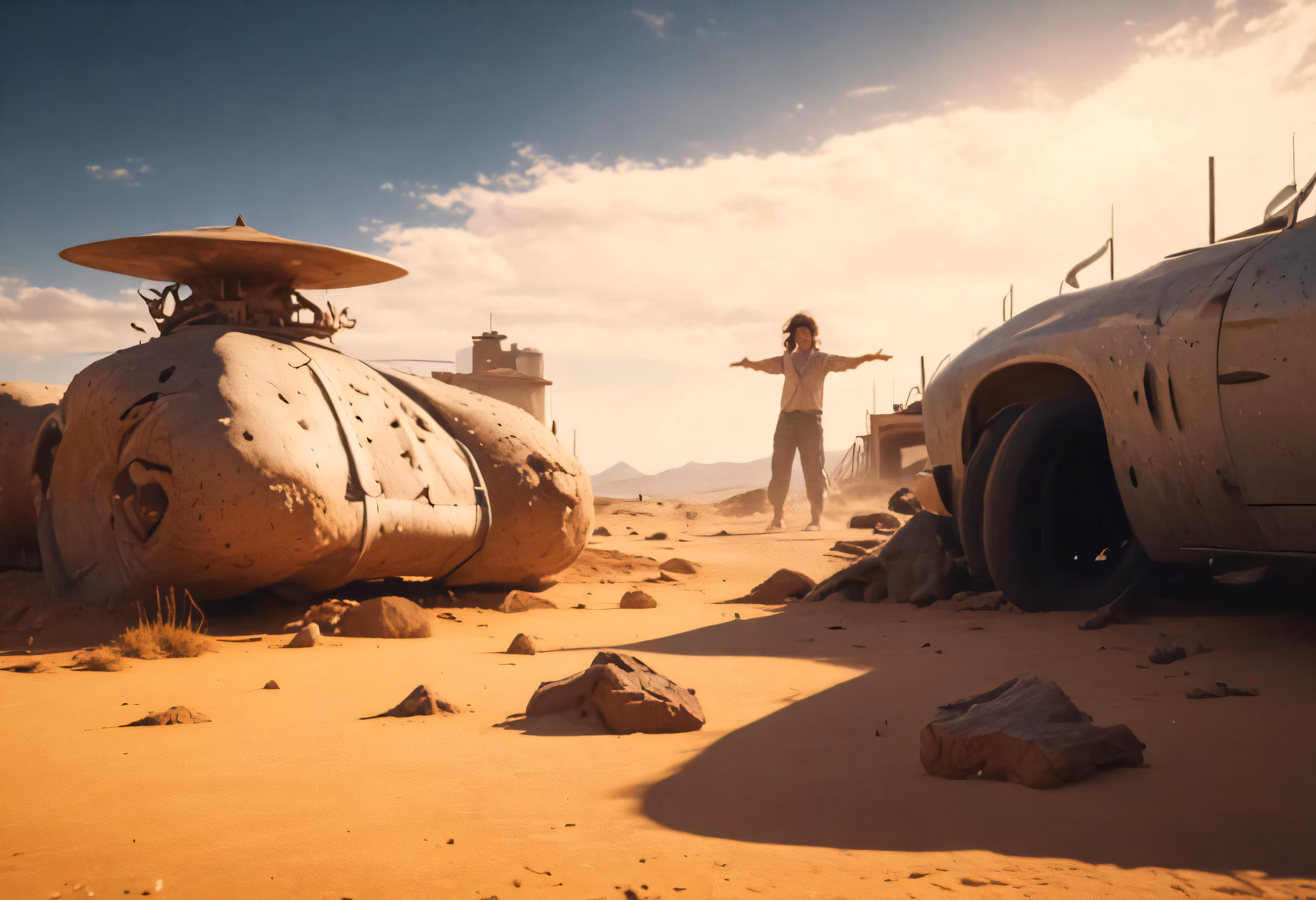 High resolution picture, free to use, a man stands near an alien car in the desert