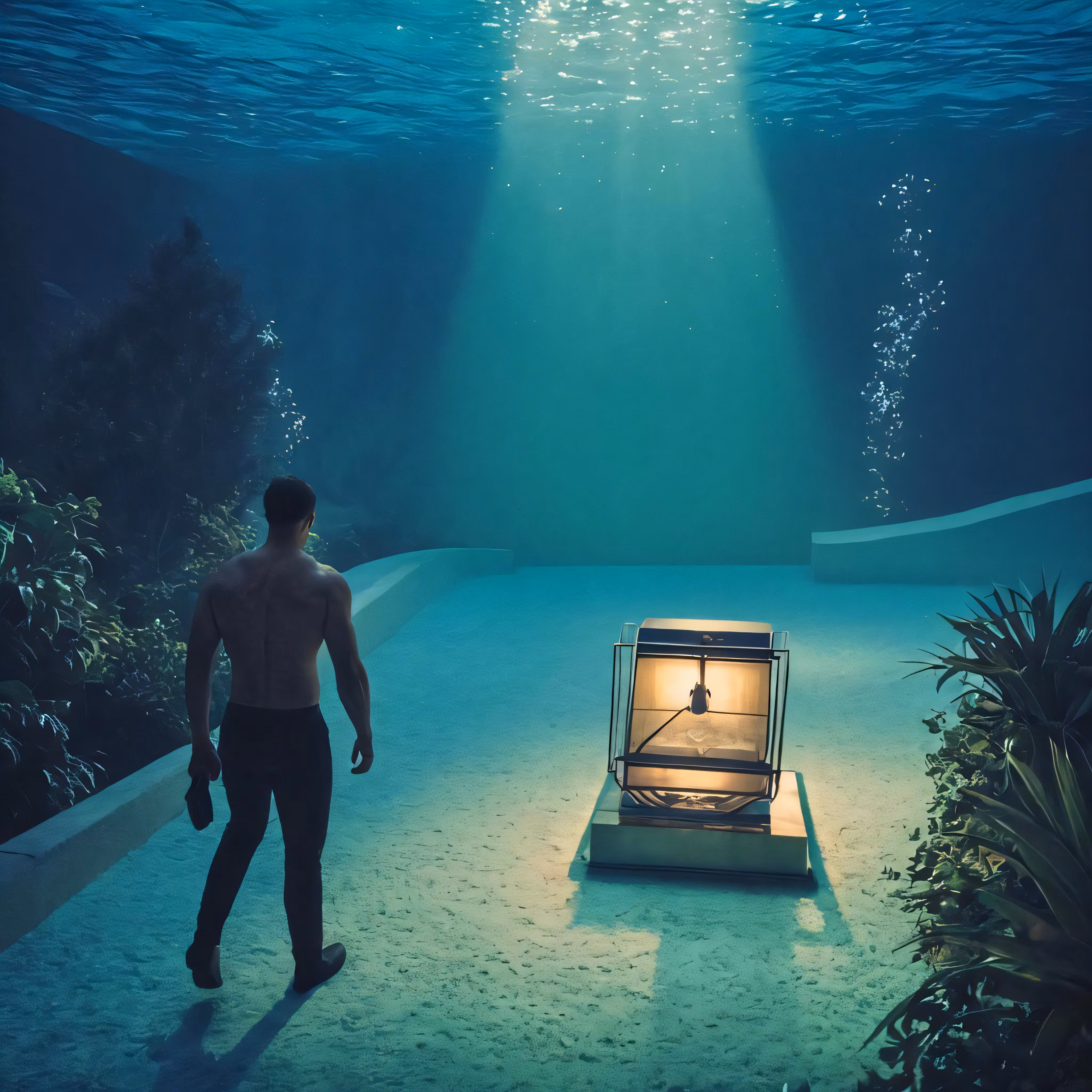 High resolution picture, free to use, a man stands next to a suitcase under water