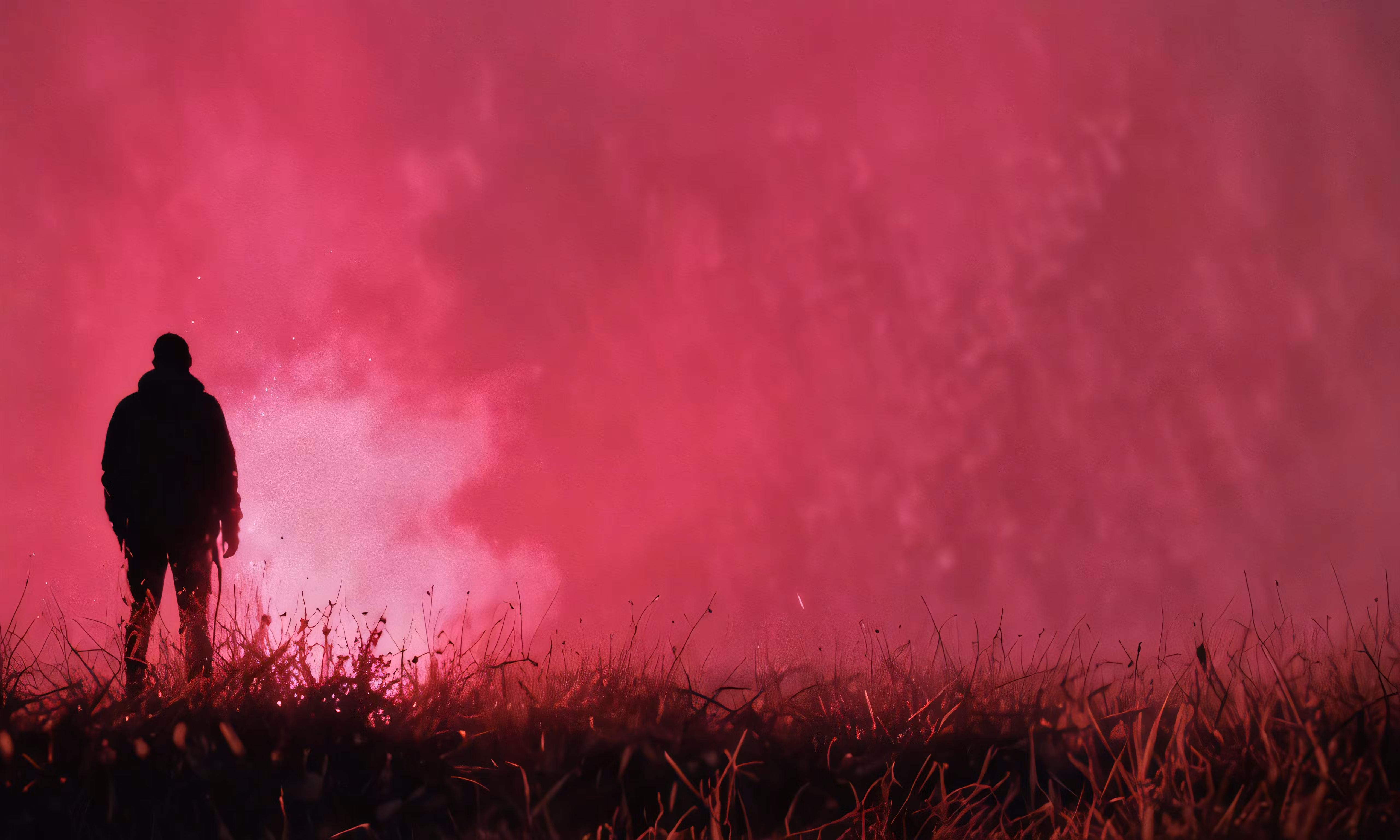 High resolution picture, free to use, a man stands on a foggy hillside as pink light from the fog lifts up