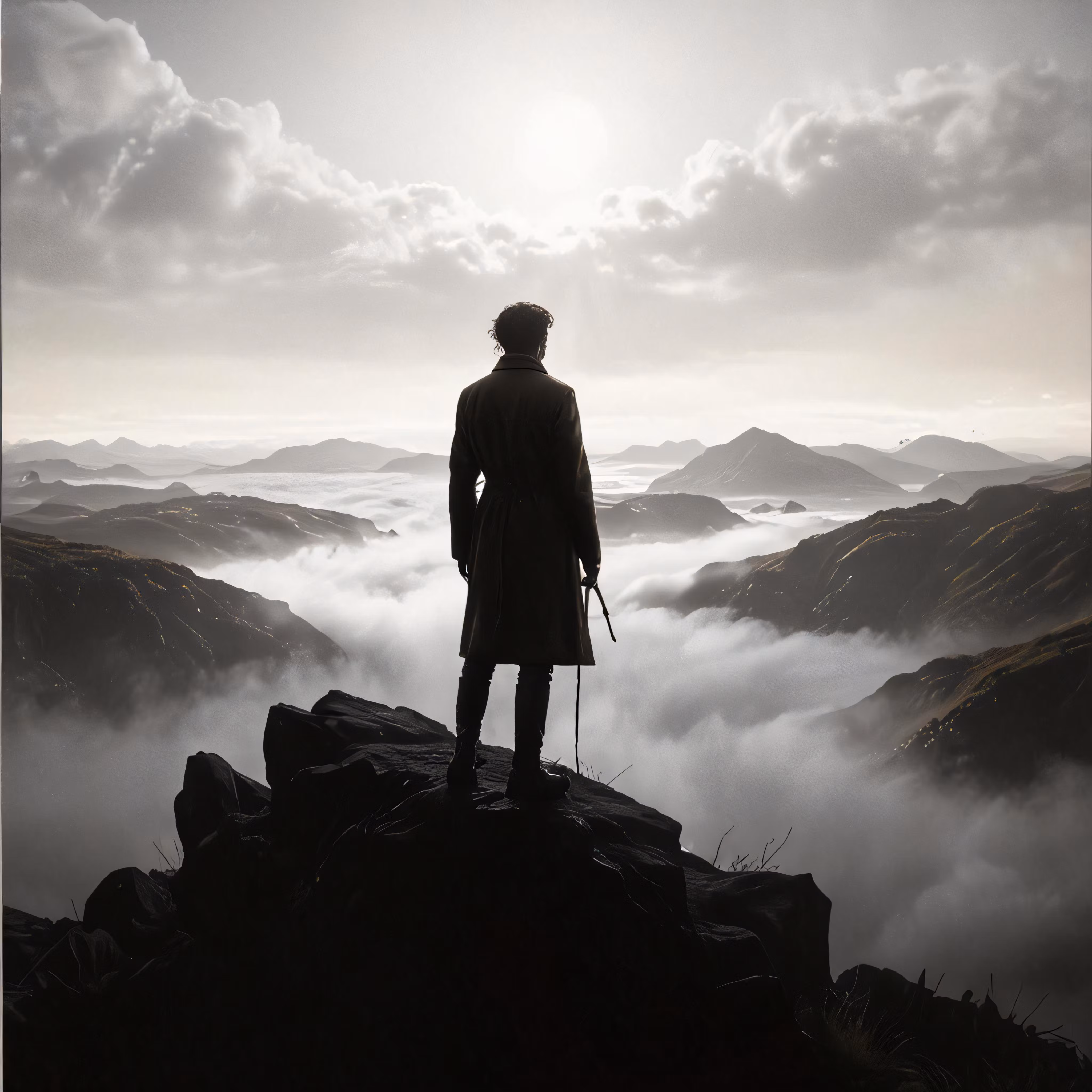 High resolution picture, free to use, a man stands on a rocky peak above a large valley