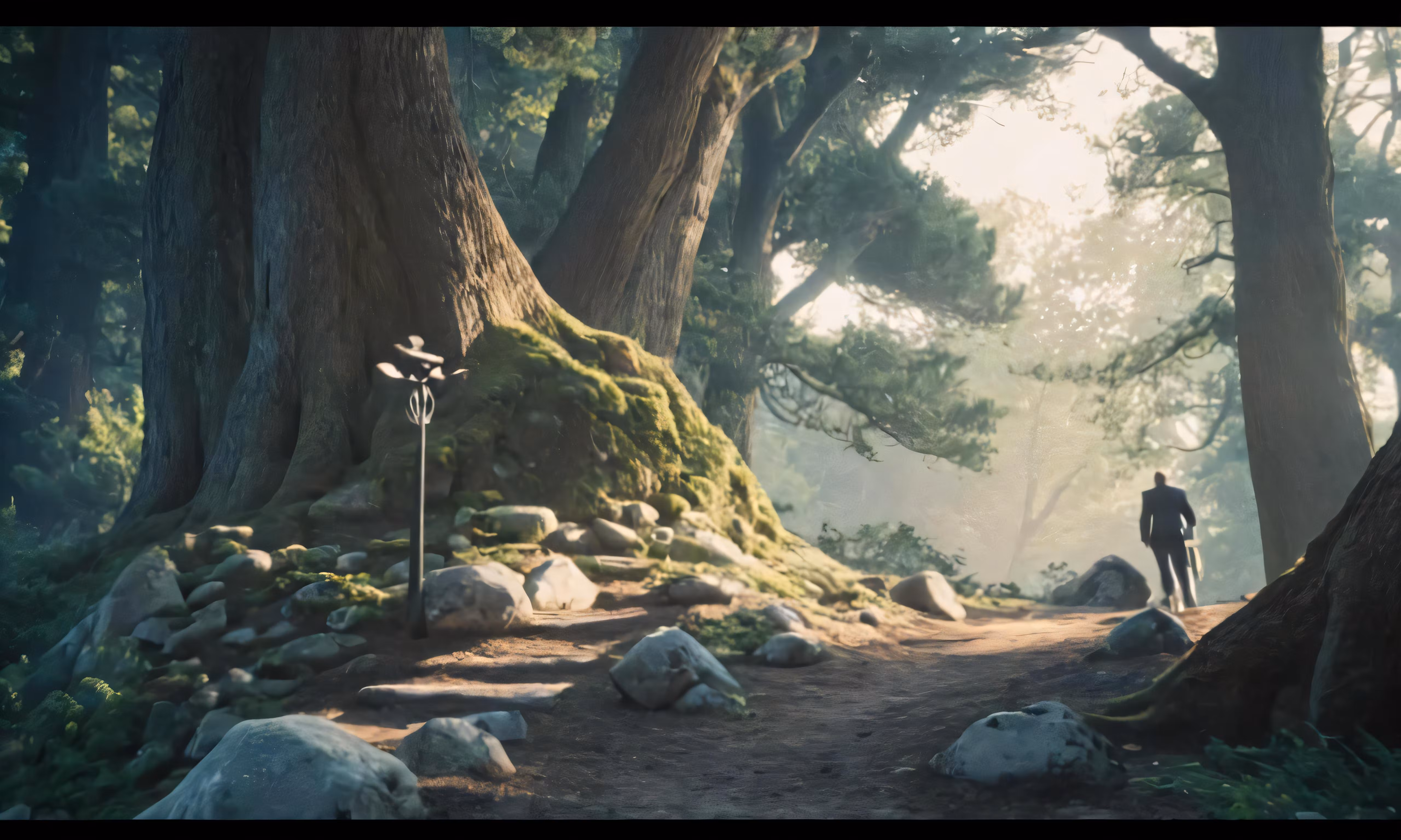 High resolution picture, free to use, a man walking across a forest with rocks, trees and bushes