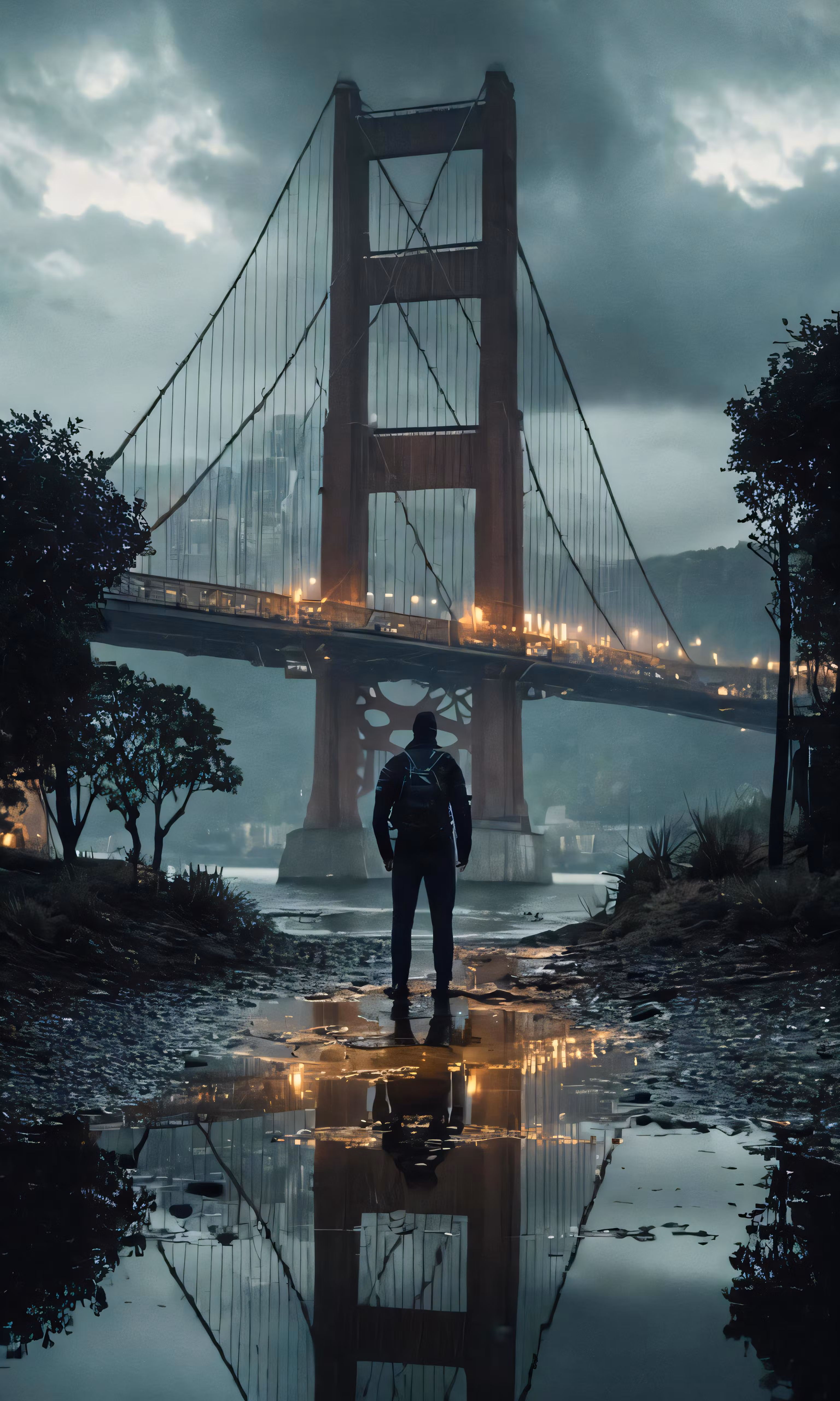 High resolution picture, free to use, a man walking along a road in front of a suspension bridge