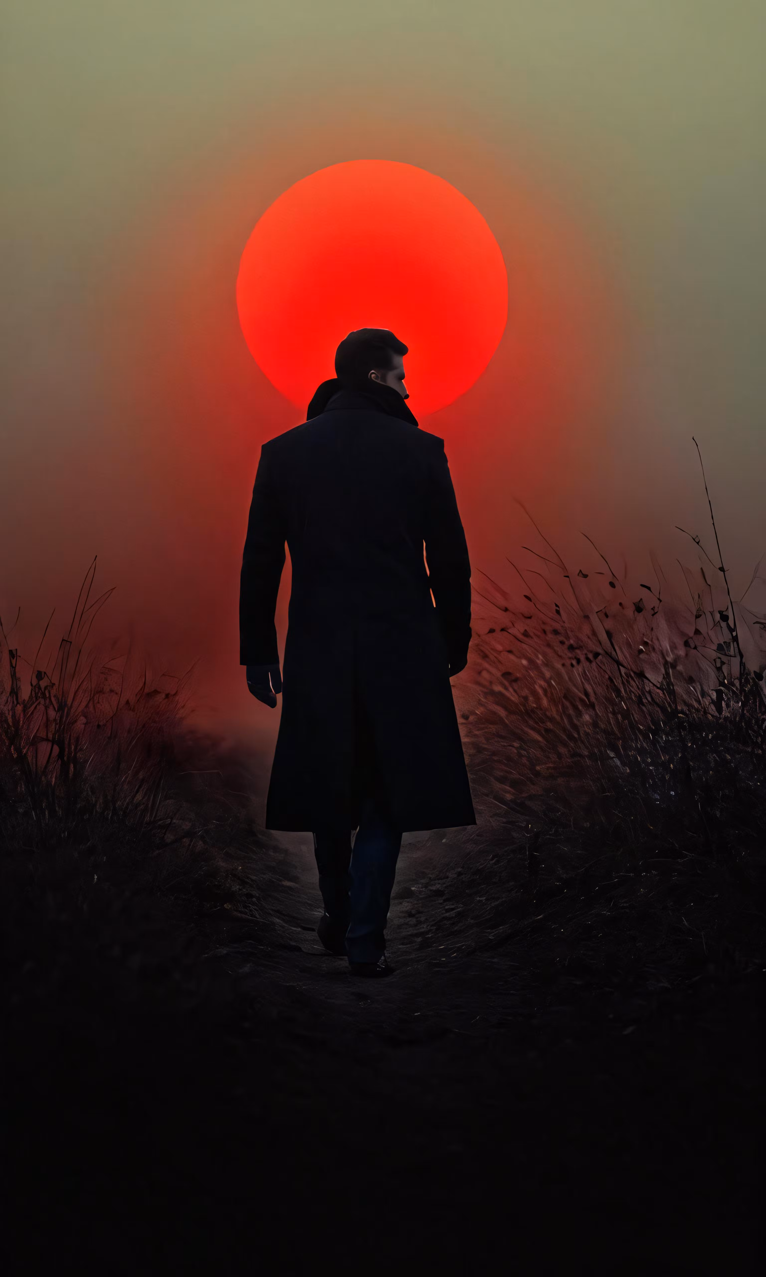 High resolution picture, free to use, a man walking down a dirt road in front of a bright red sun