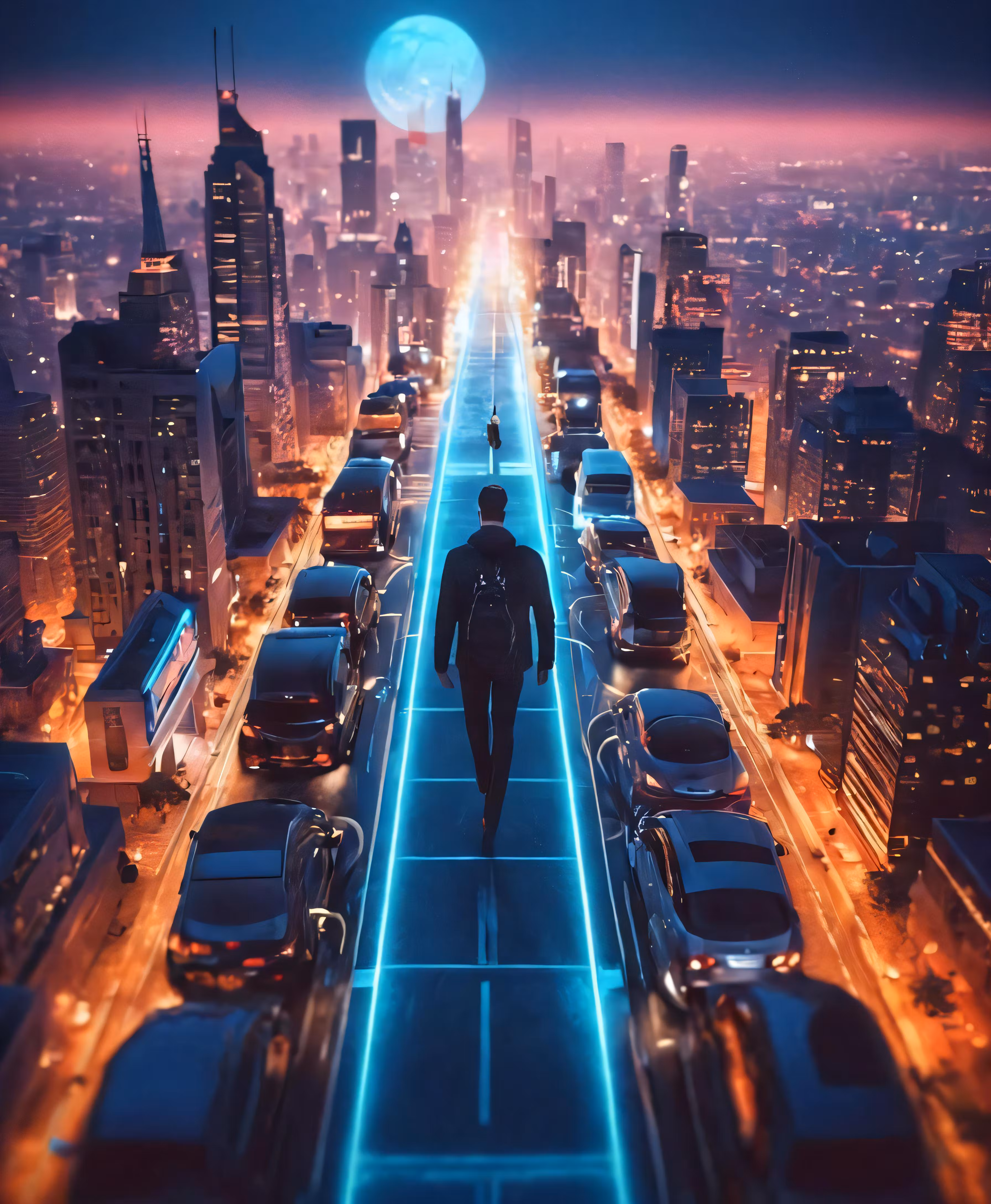 High resolution picture, free to use, a man walking down the road that is in the middle of a lot