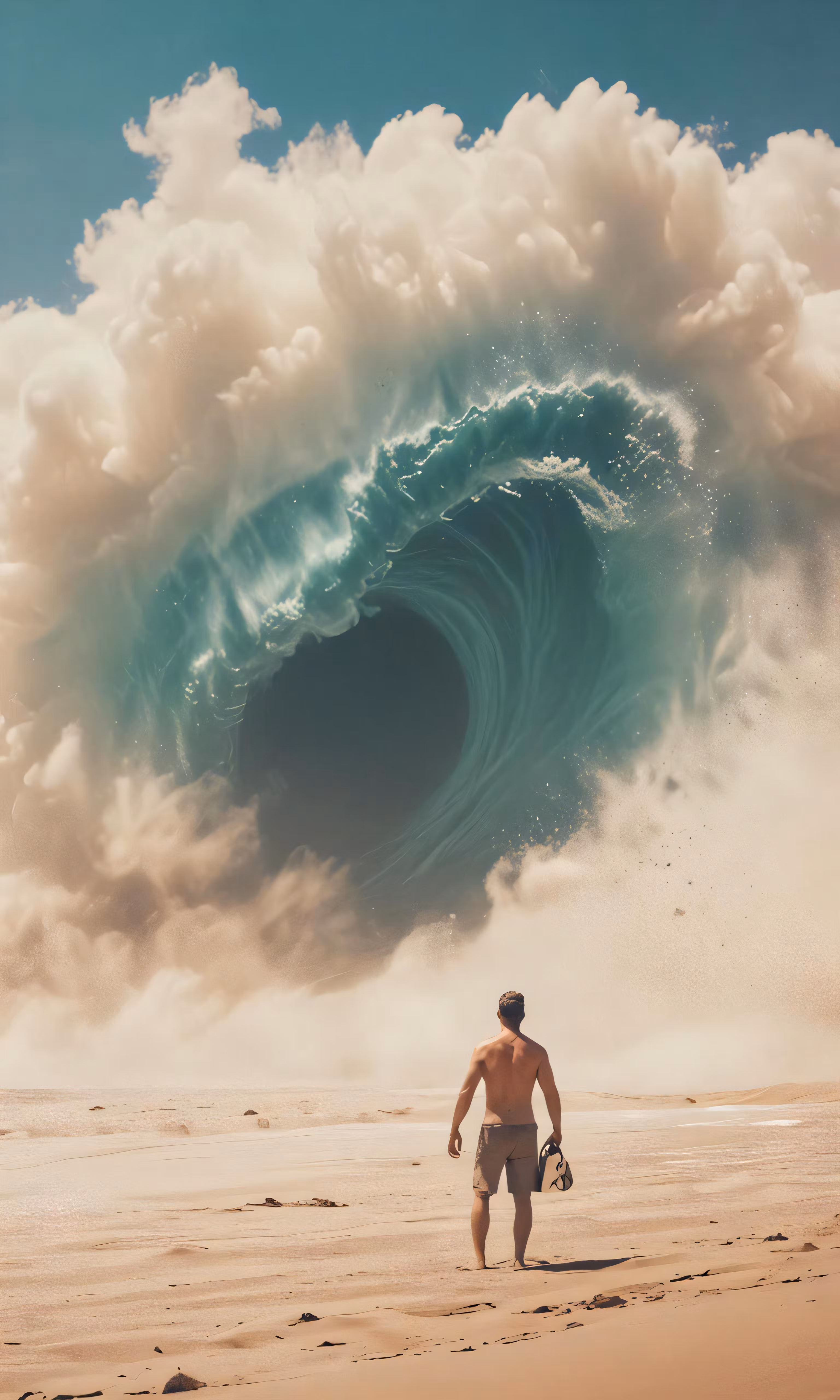 High resolution picture, free to use, a man walking on the beach next to a large wave