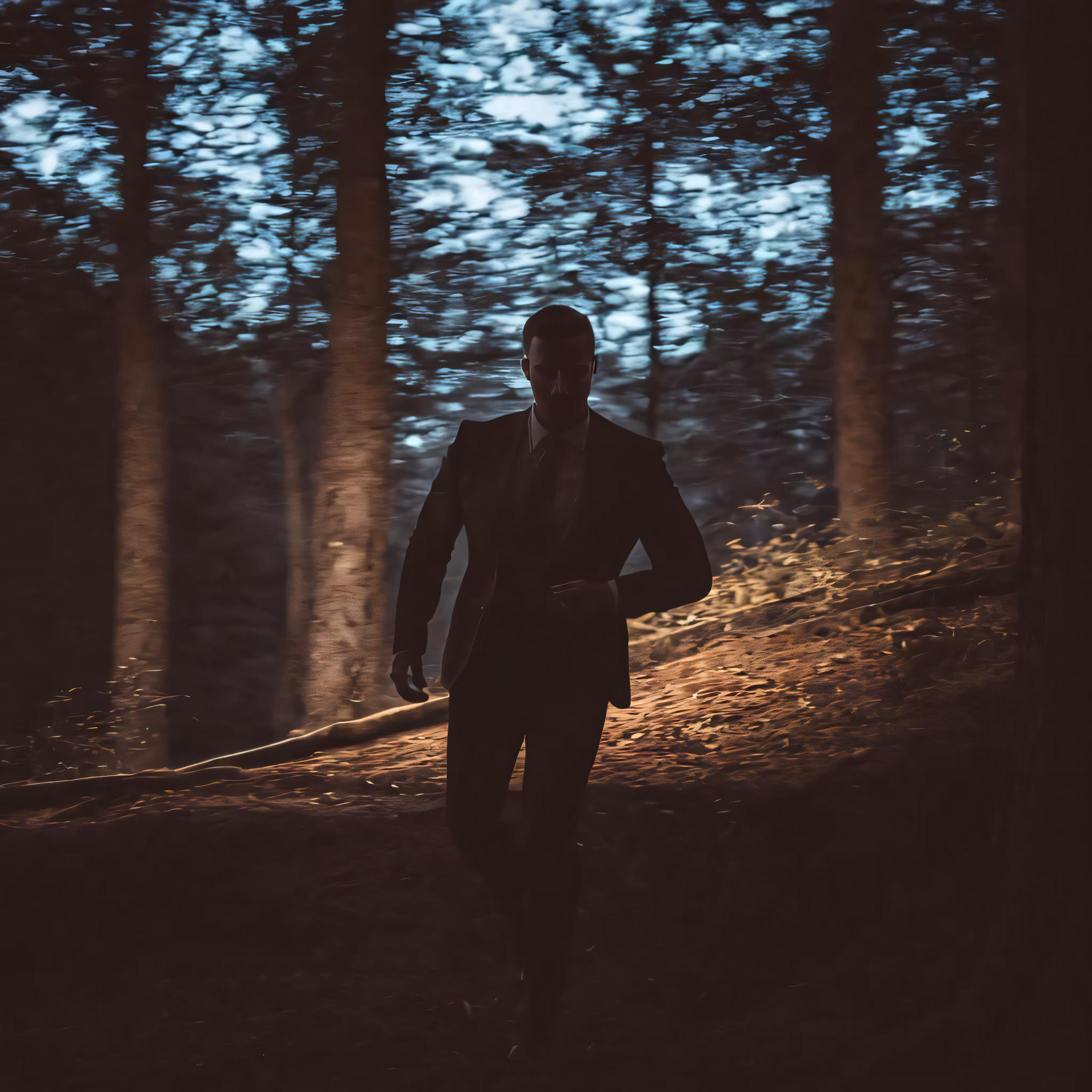 High resolution picture, free to use, a man walking through a dark wooded forest