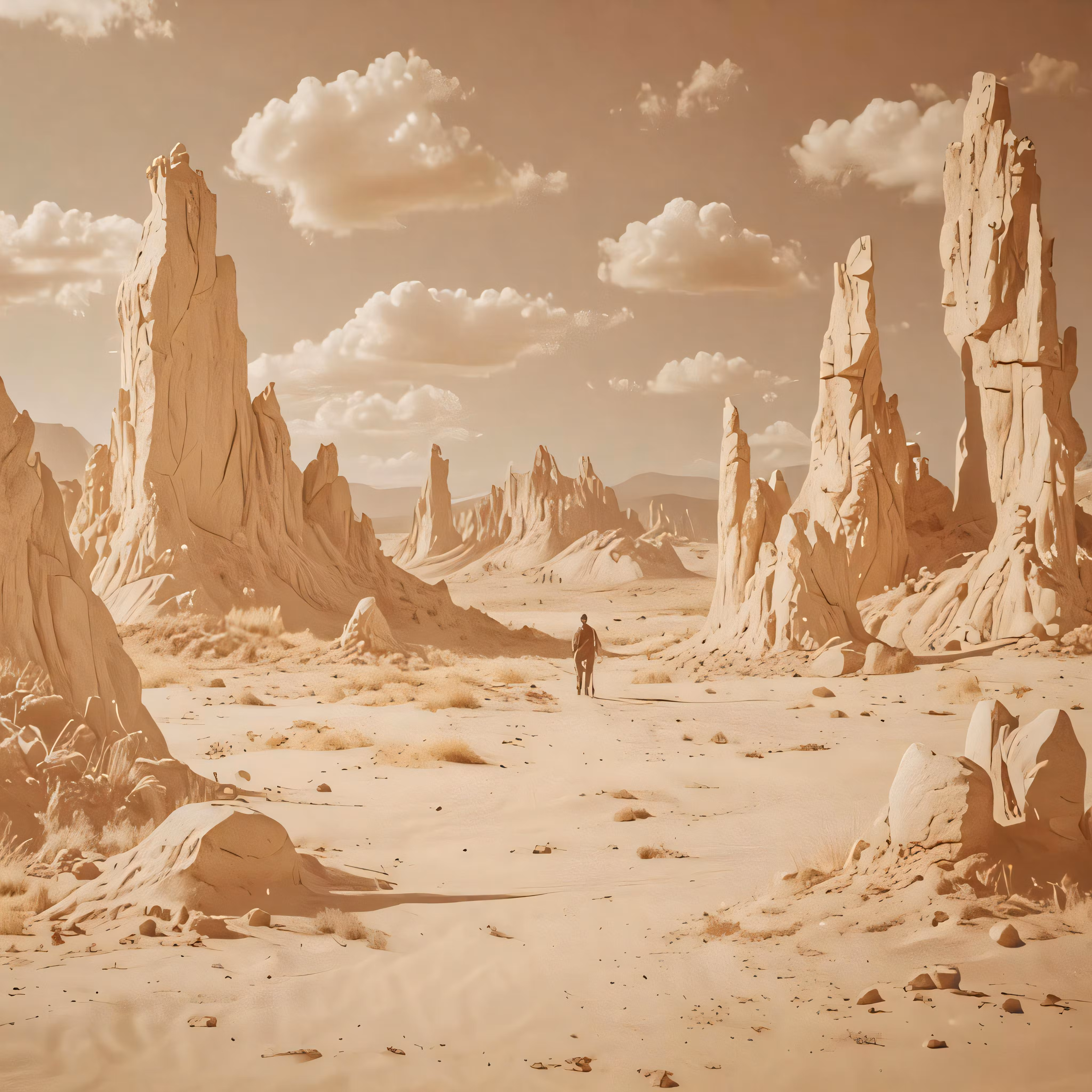 High resolution picture, free to use, a man walking through a desert like area with many tall rocks