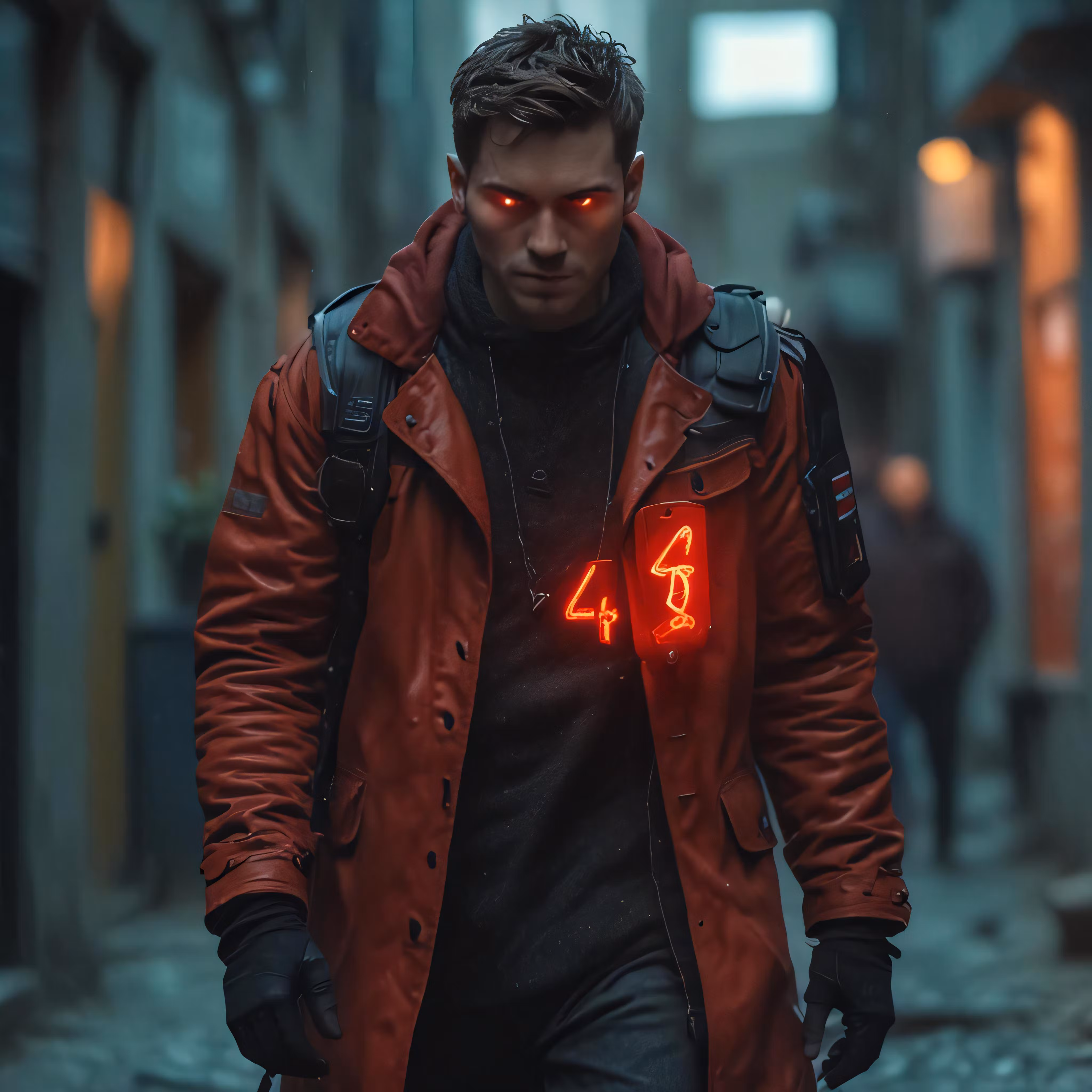 High resolution picture, free to use, a man walks down an alleyway in a leather jacket with glowing eyes