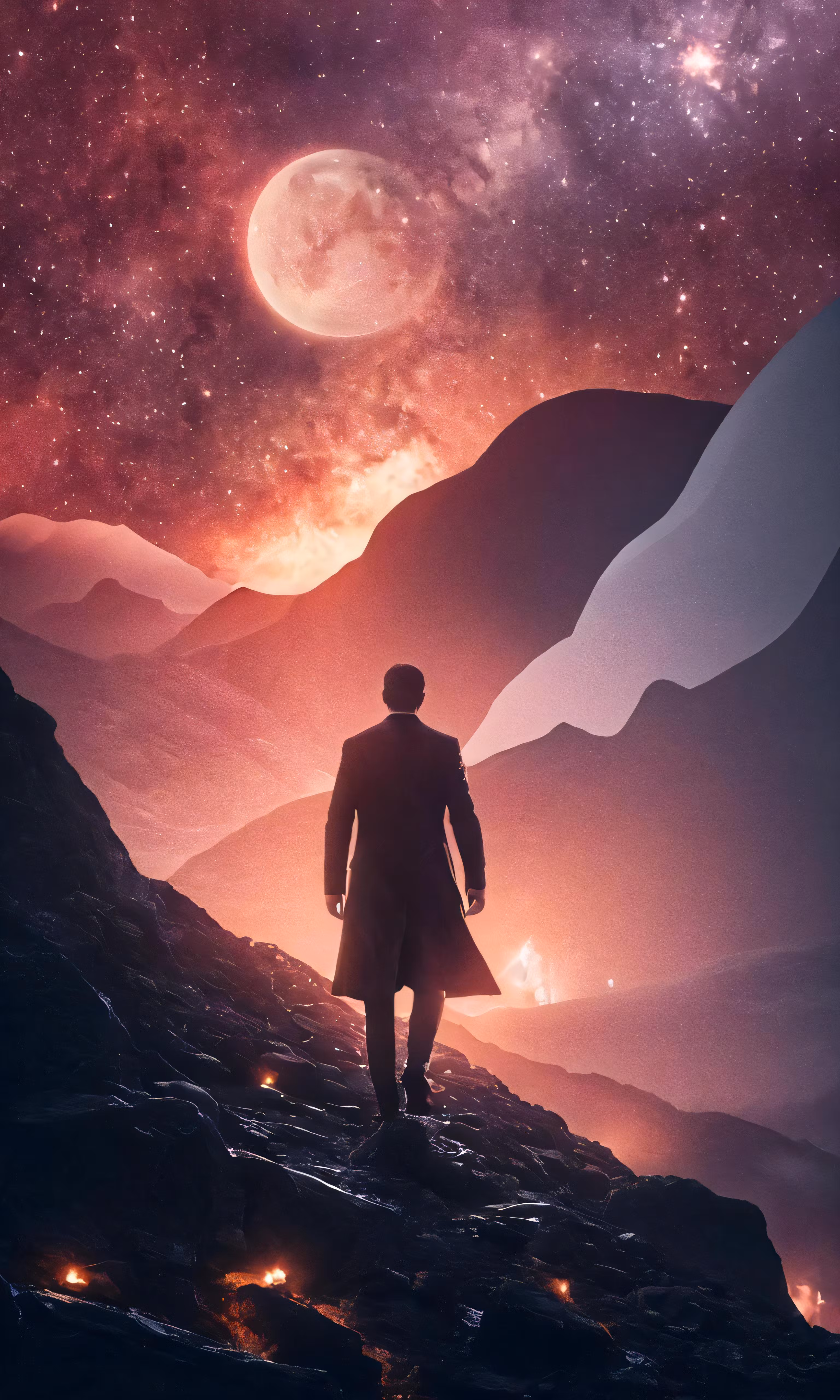 High resolution picture, free to use, a man walks on a hill with his coat on, under a star filled sky