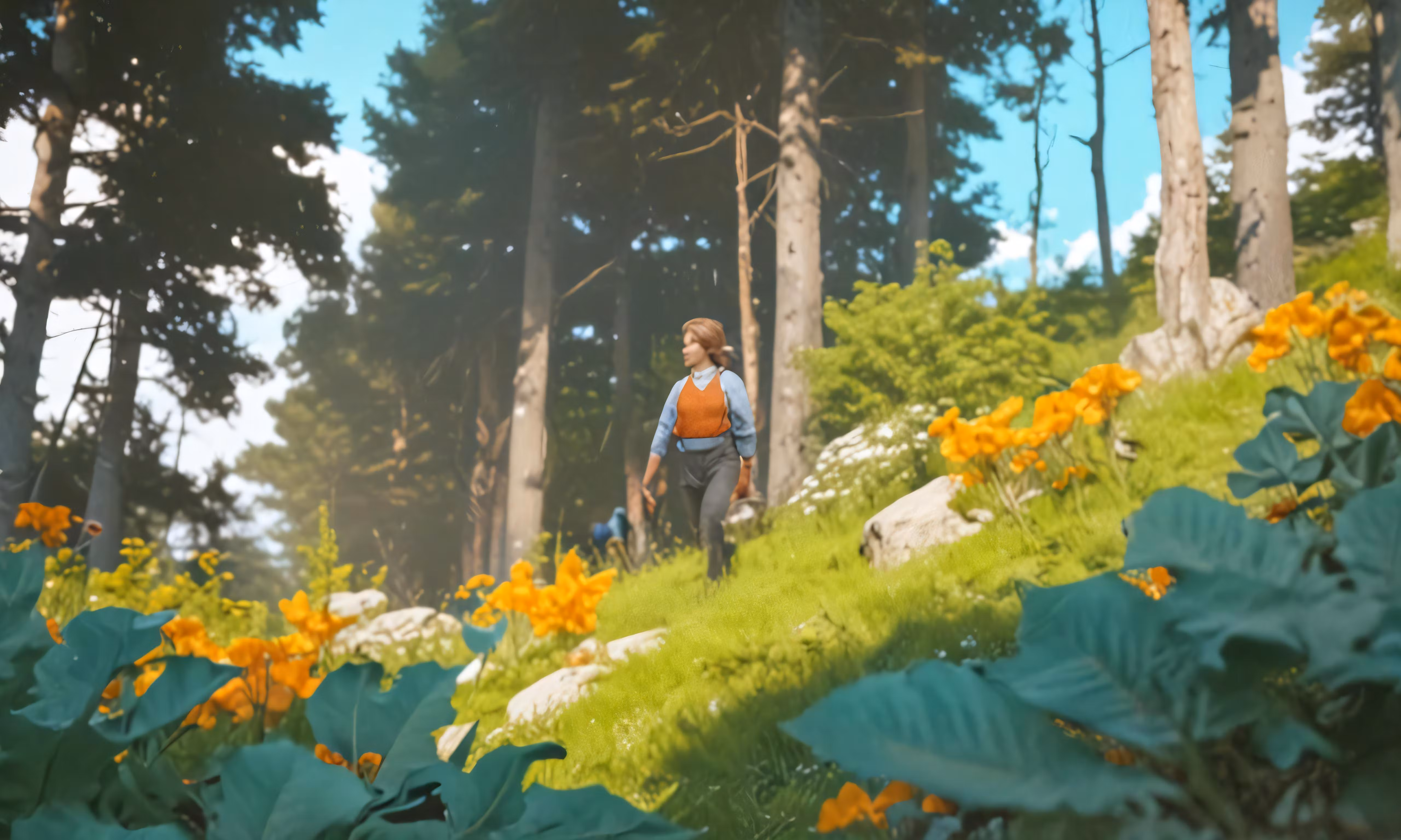 High resolution picture, free to use, a man walks through the woods in the sunlight