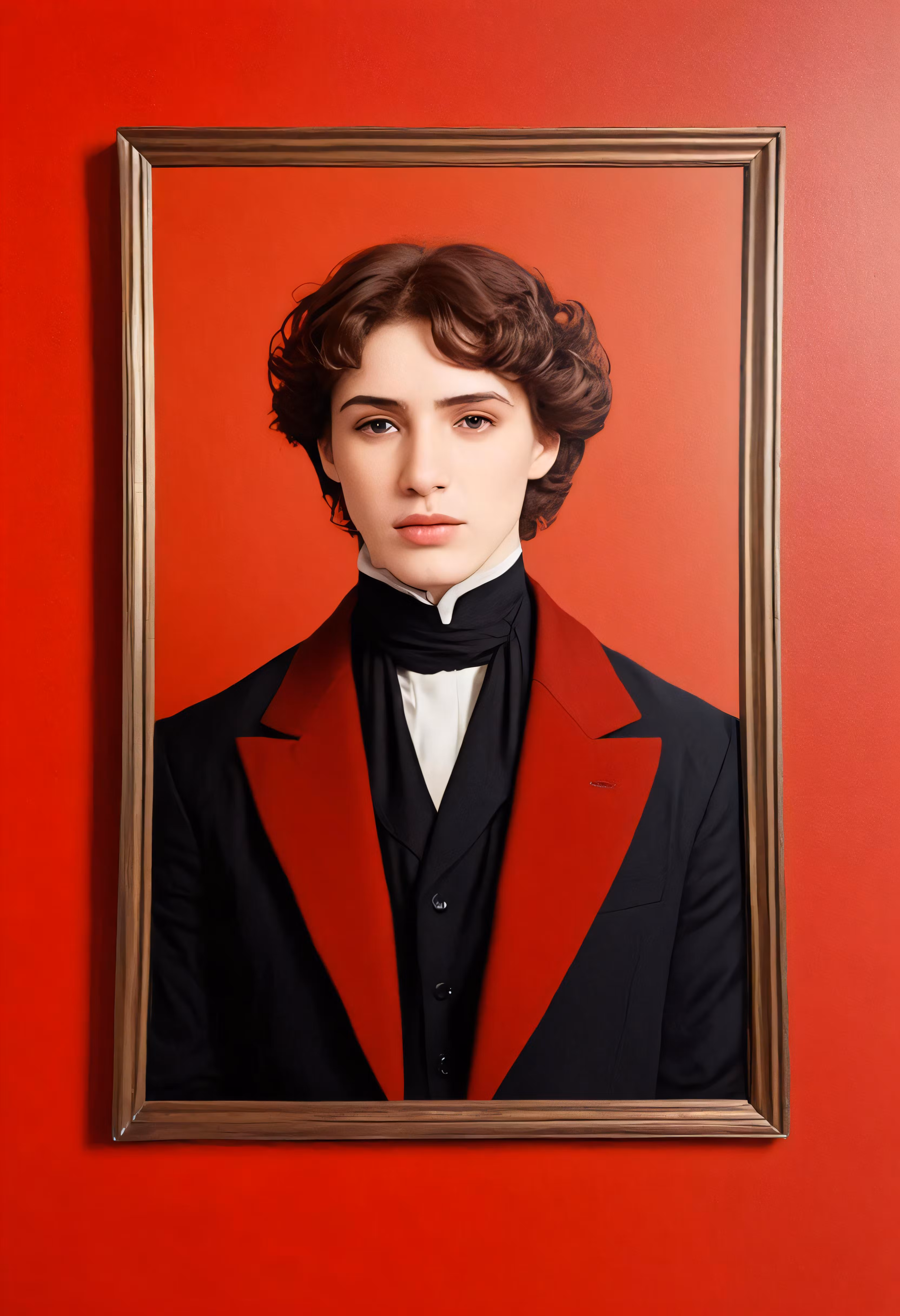 High resolution picture, free to use, a man wearing a black and red suit with black lapel collar in a frame on a red background