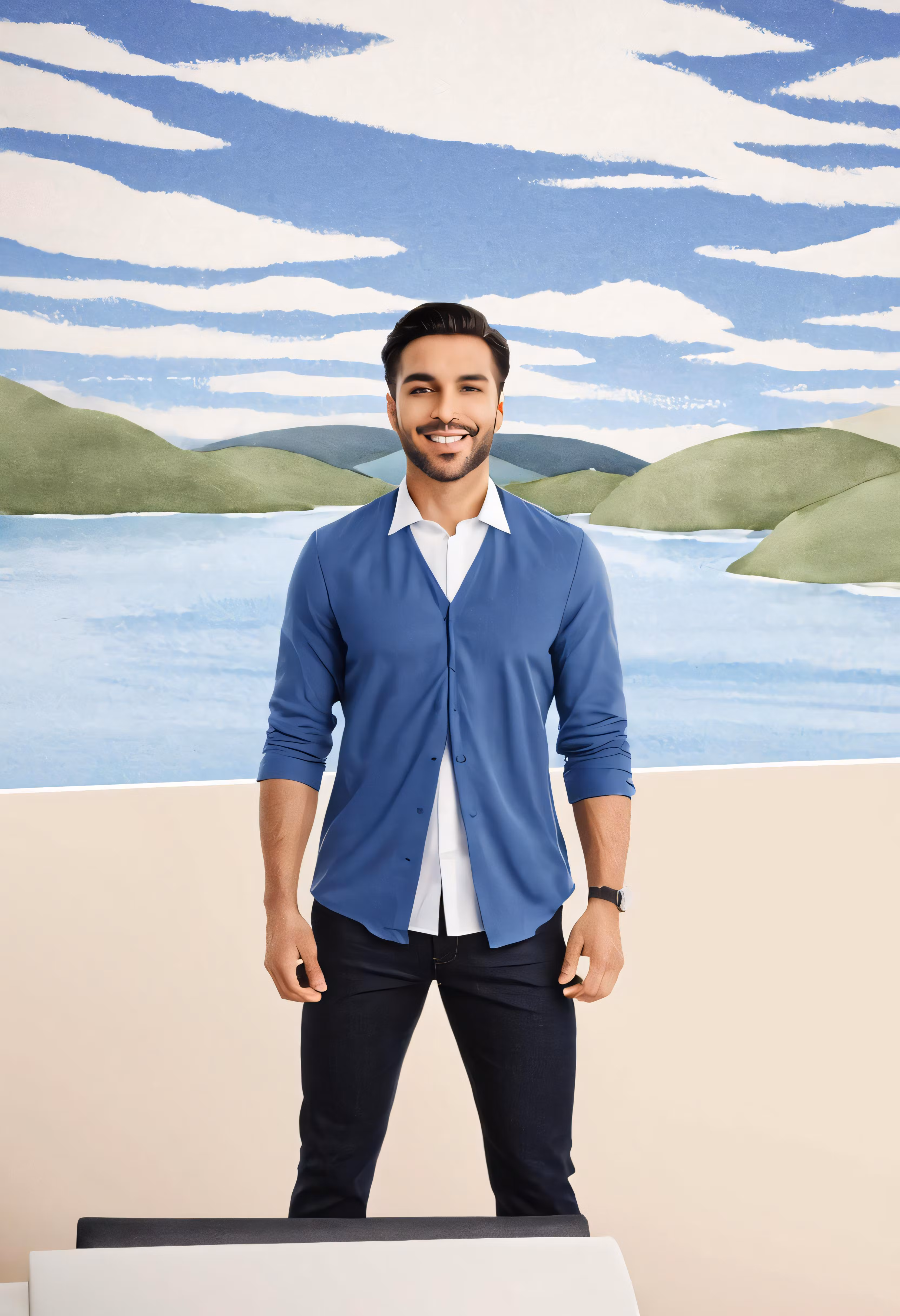 High resolution picture, free to use, a man wearing a blue cardigan poses for a portrait