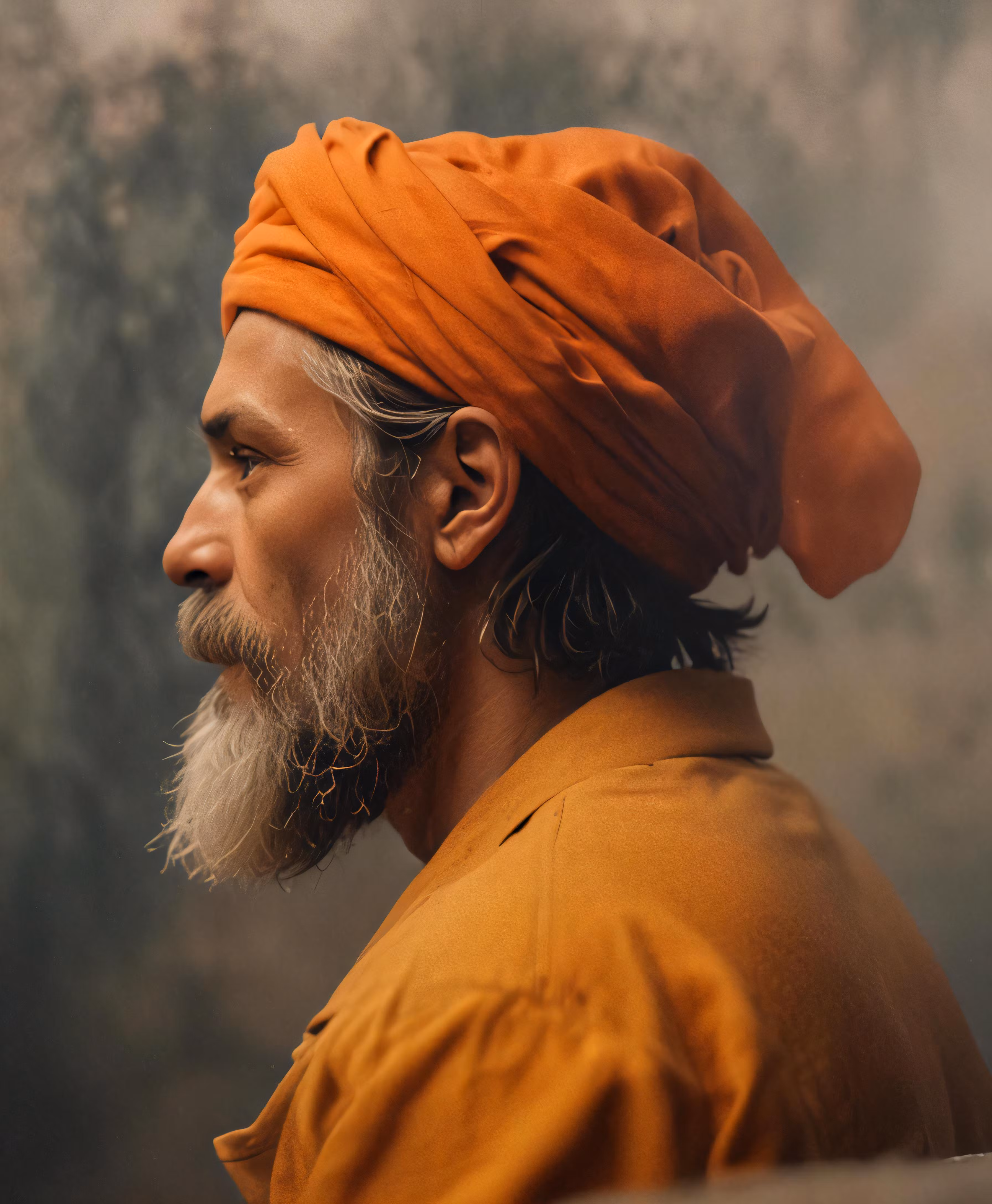 High resolution picture, free to use, a man wearing a orange turban looks off to the side