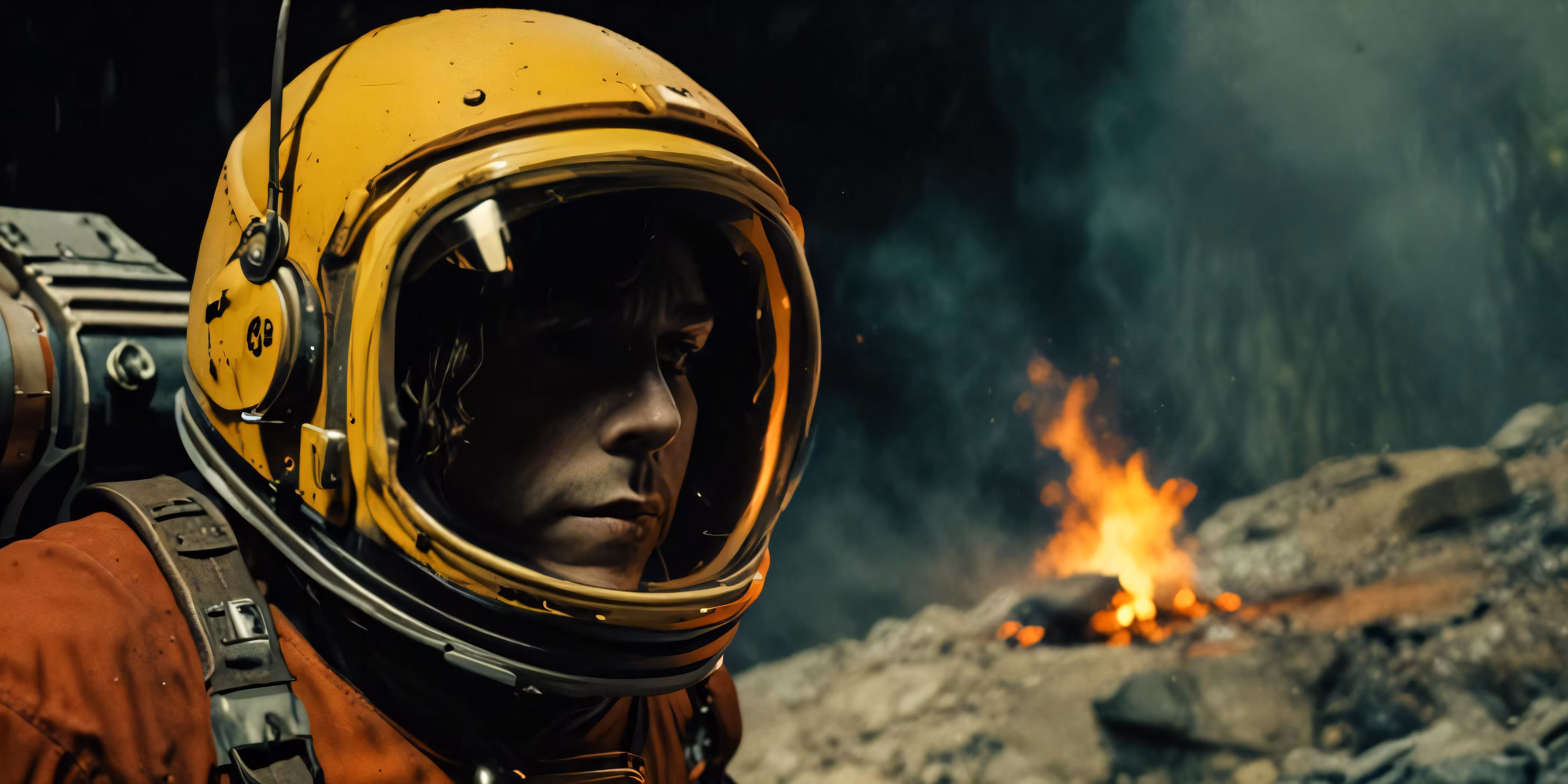 High resolution picture, free to use, a man wearing a space suit and helmet in front of a fire