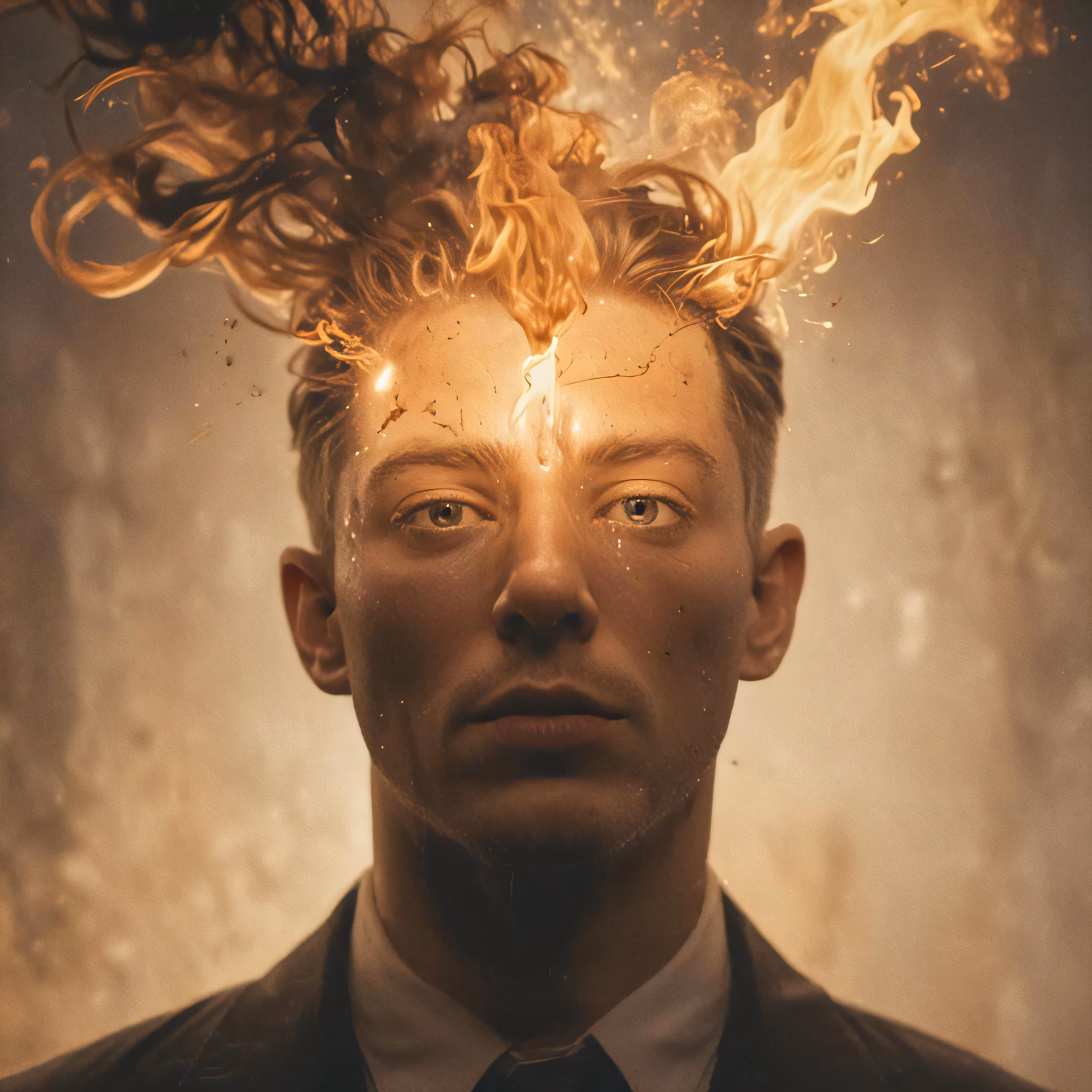 High resolution picture, free to use, a man wearing a suit and tie has the flame coming out of his head
