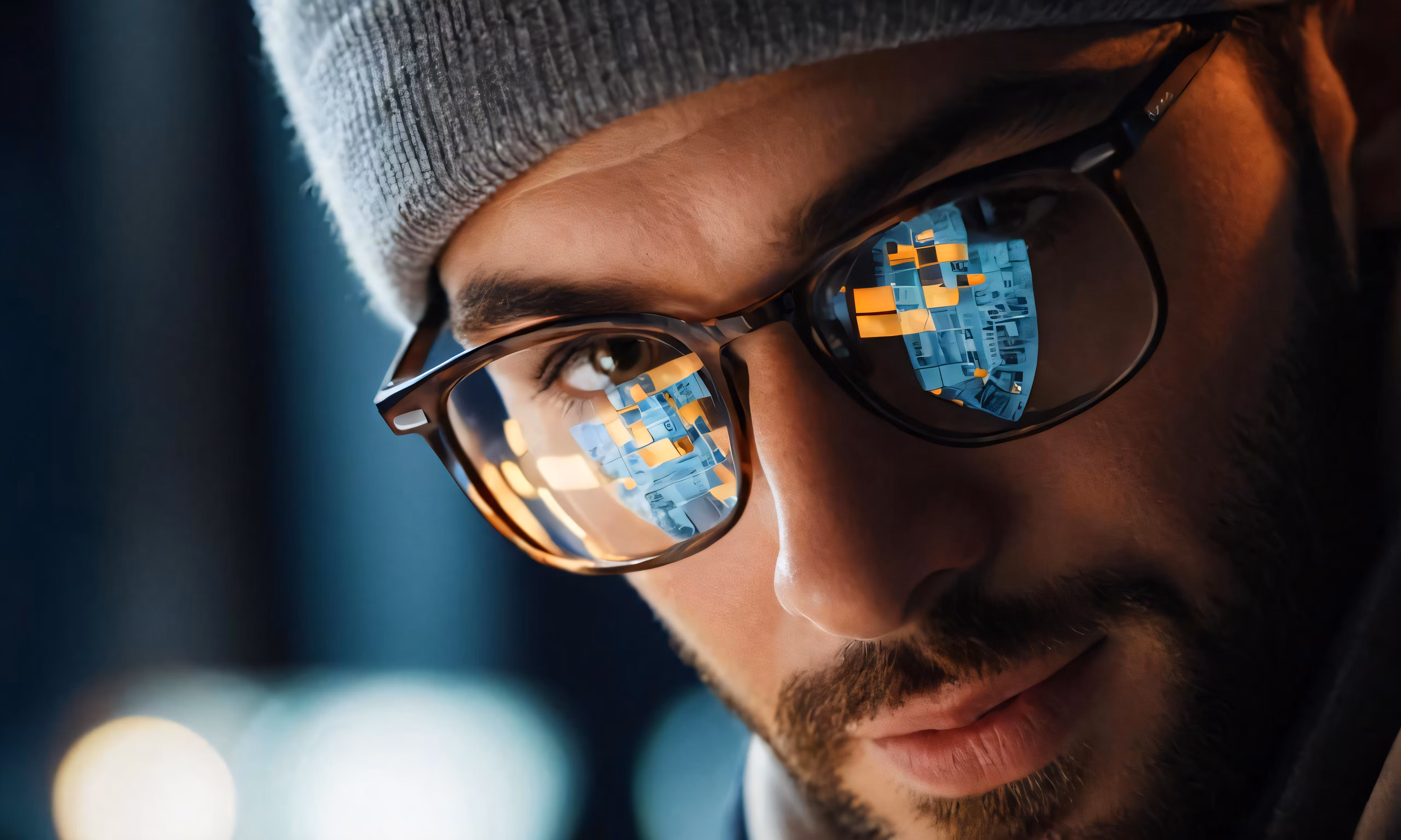 High resolution picture, free to use, a man wearing glasses that have mosaic art on them