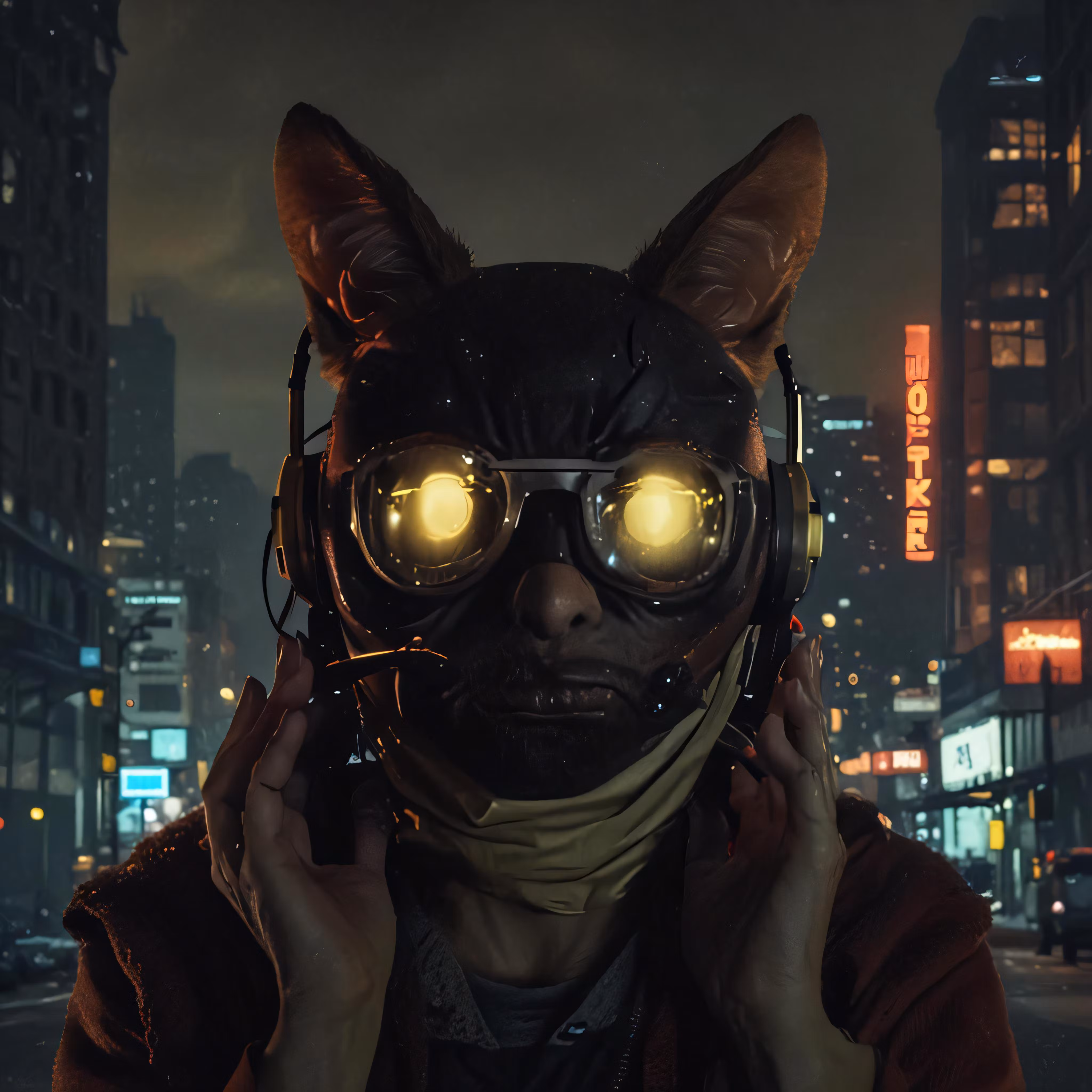 High resolution picture, free to use, a man wearing headphones with yellow eyes and head covering in the city at night
