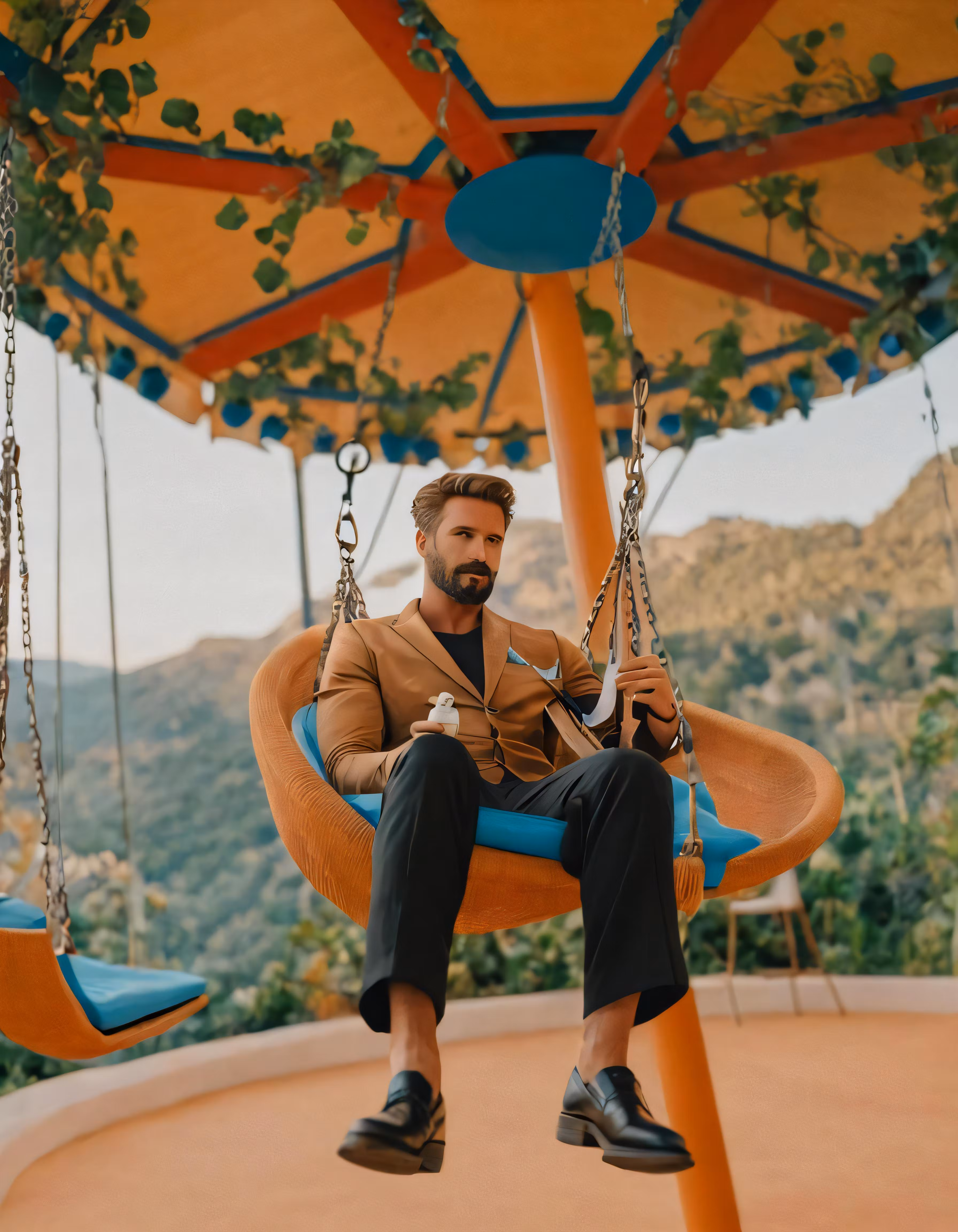 High resolution picture, free to use, a man with a beard and mustache sitting on a swing chair at a park