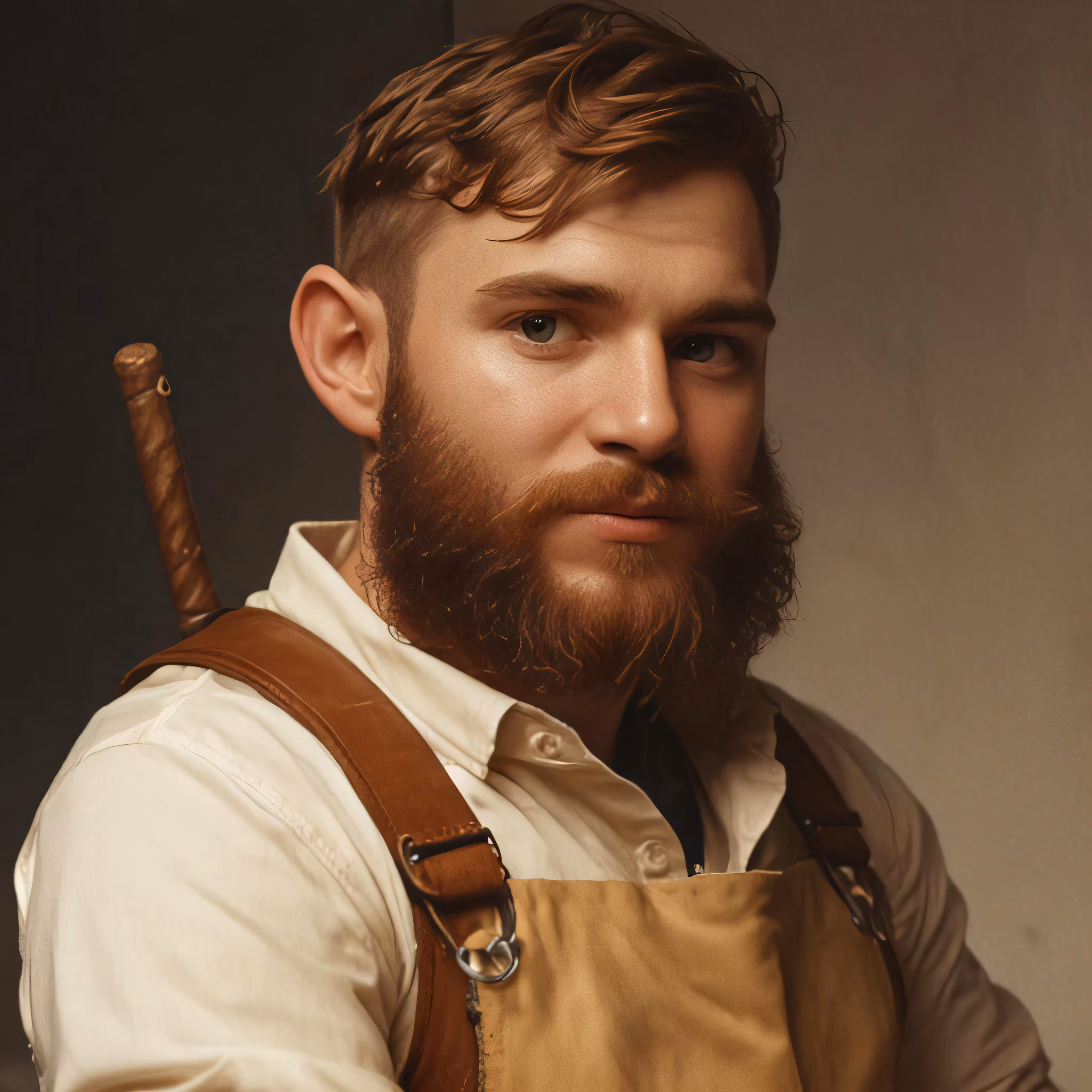 High resolution picture, free to use, a man with a big, red beard wearing suspenders and holding a baseball bat
