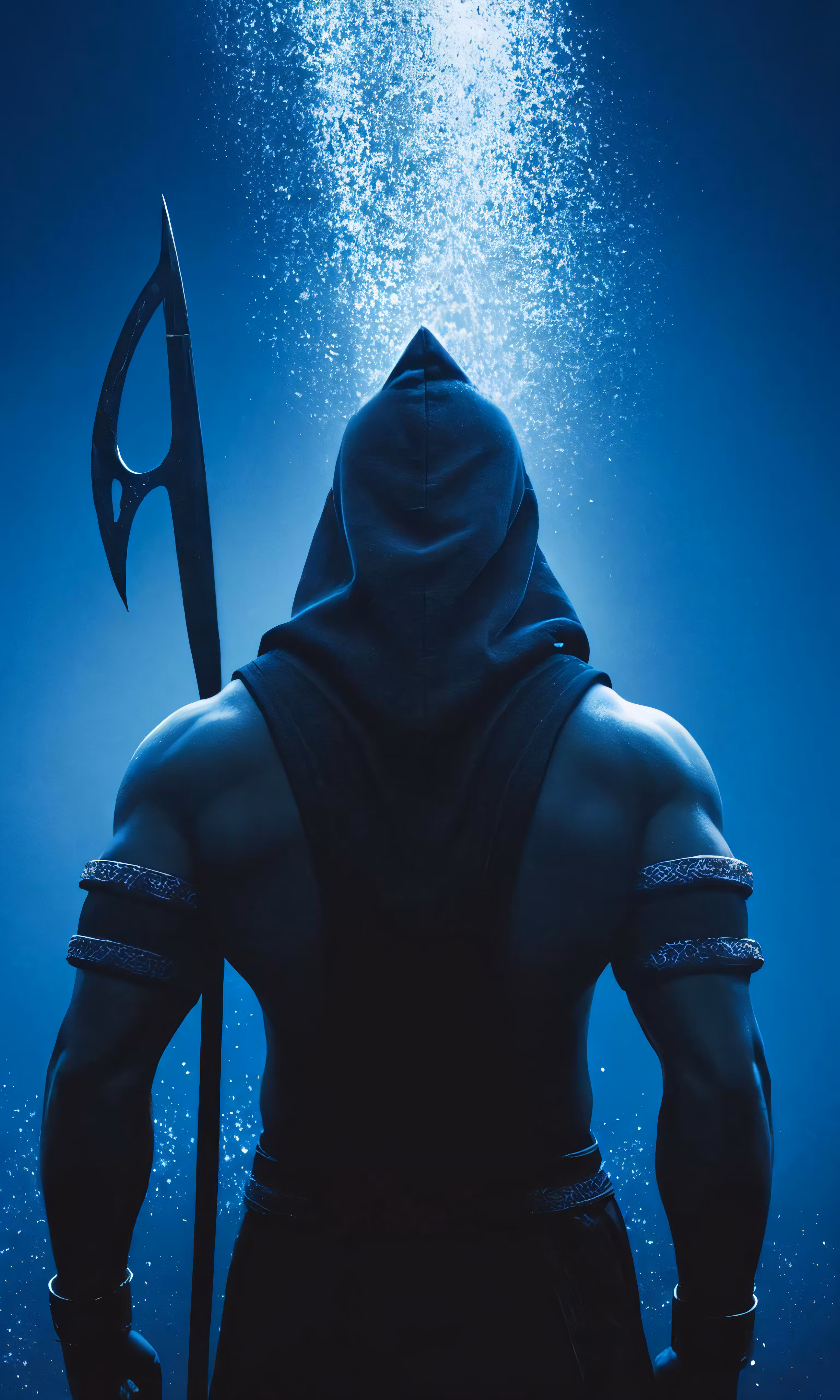 High resolution picture, free to use, a man with a spear and a hooded sweatshirt standing in the water