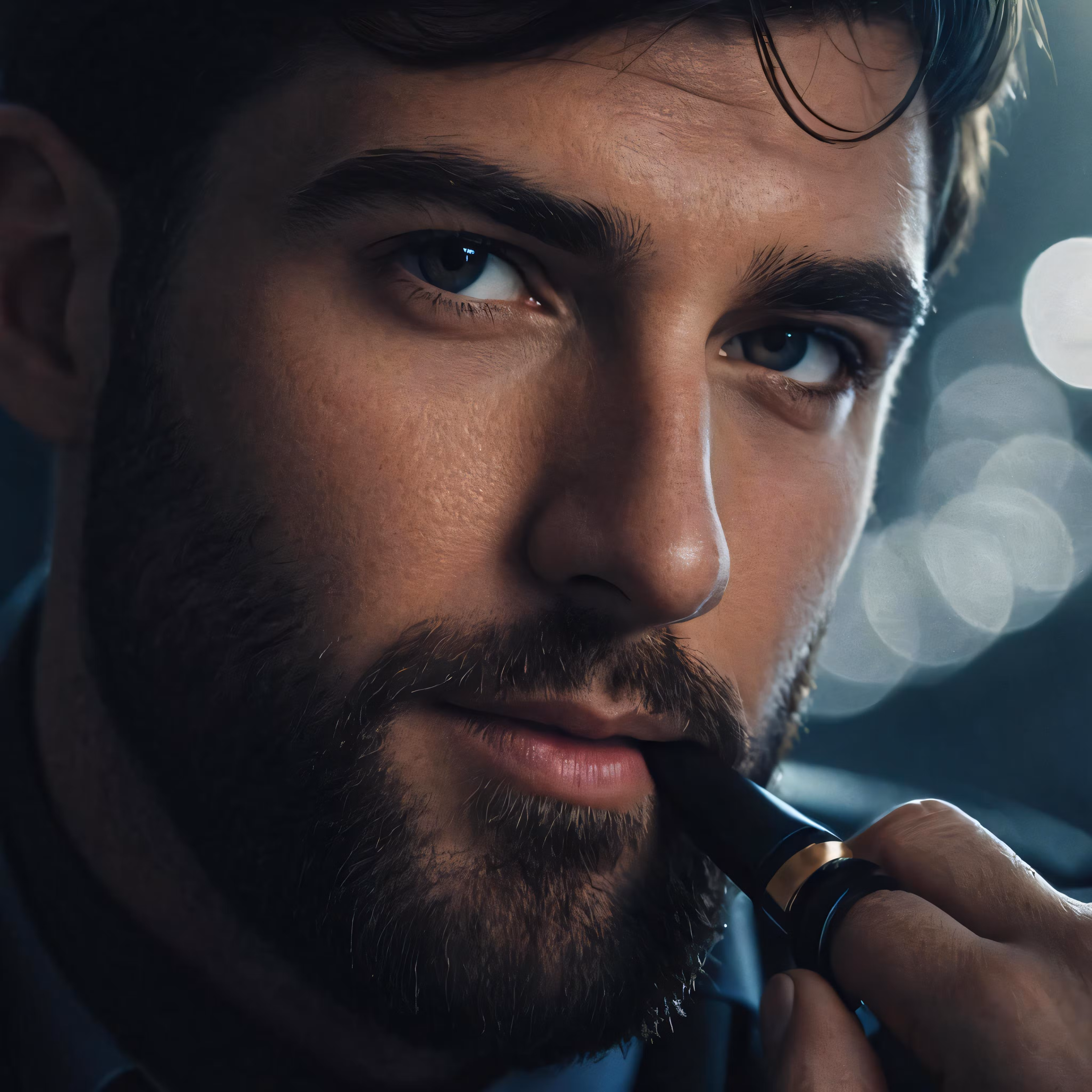 High resolution picture, free to use, a man with a tie, jacket and tie, putting on his black pen in his mouth