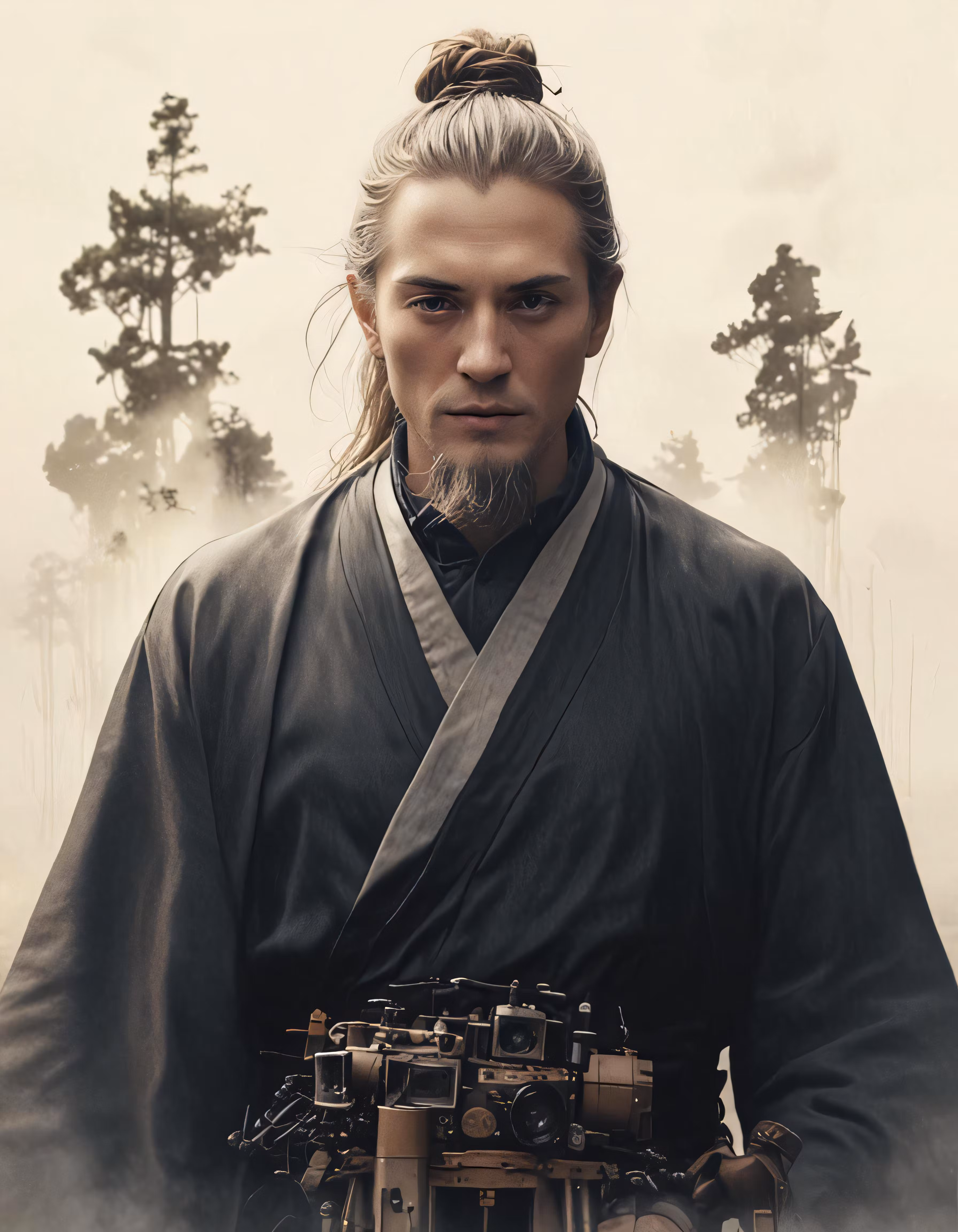 High resolution picture, free to use, a man with a weird hairdo and long grey beard in a dark outfit