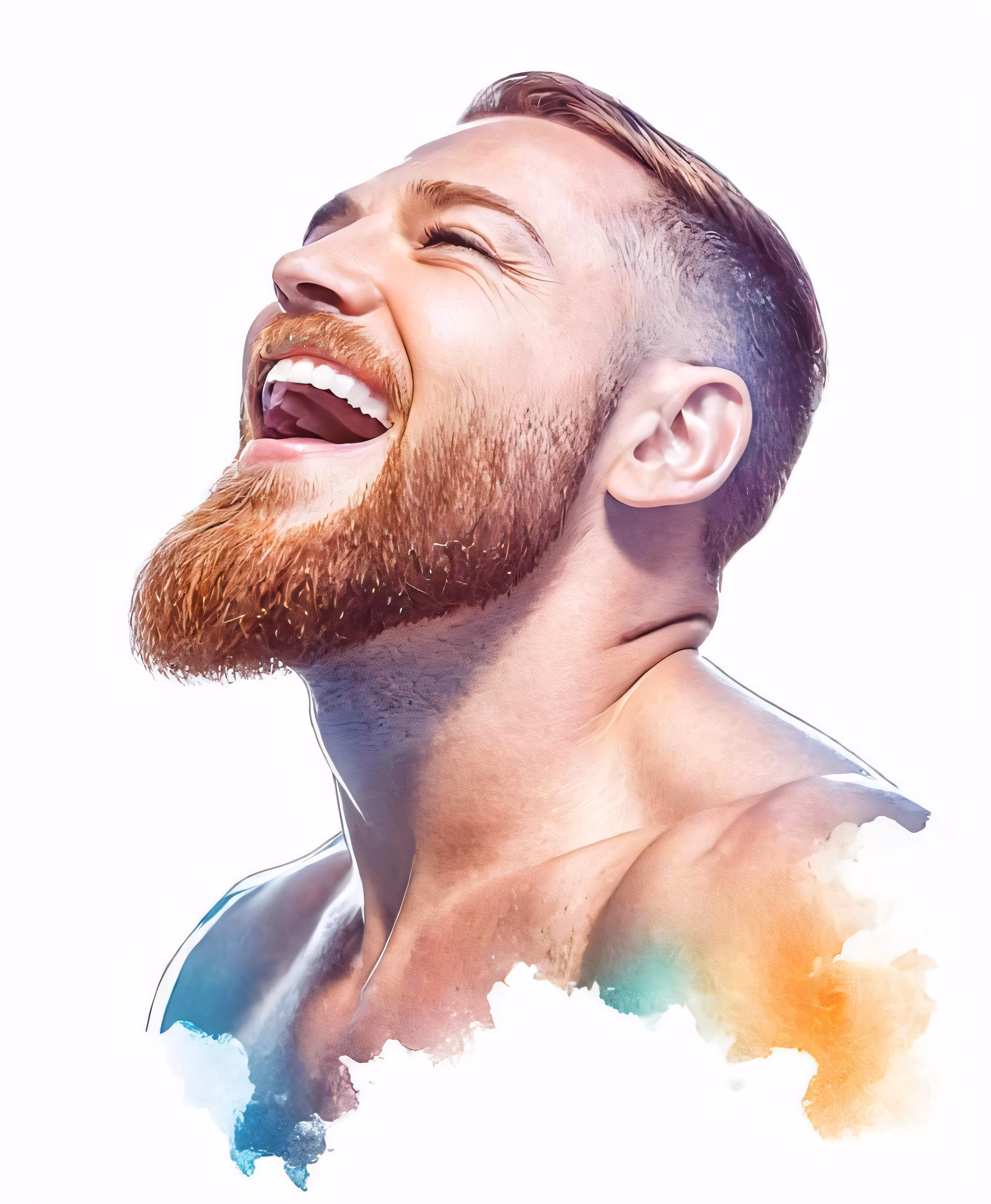 High resolution picture, free to use, a man with beard and orange and blue accents laughing