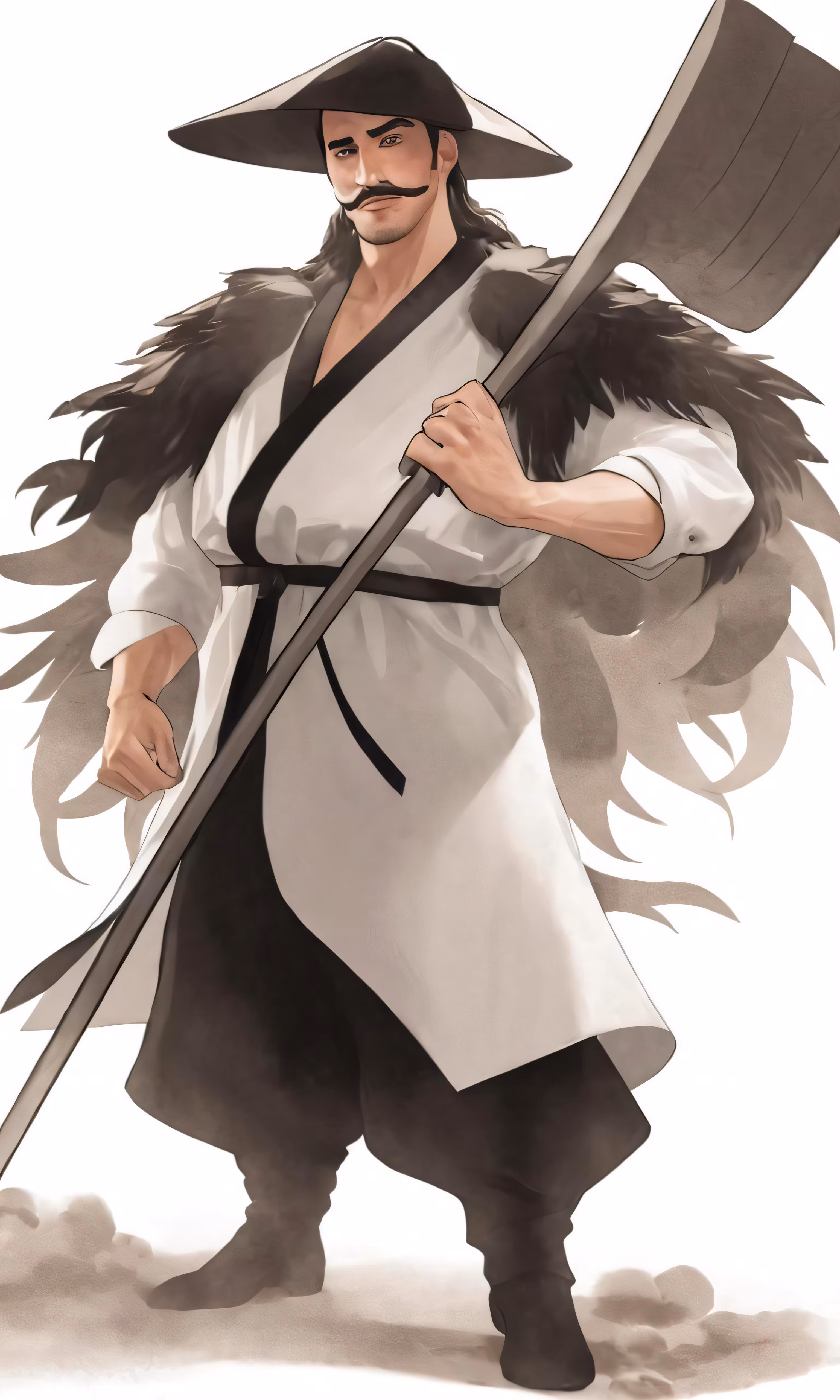 High resolution picture, free to use, a man with black feathers holding a large metal spear and a paddle