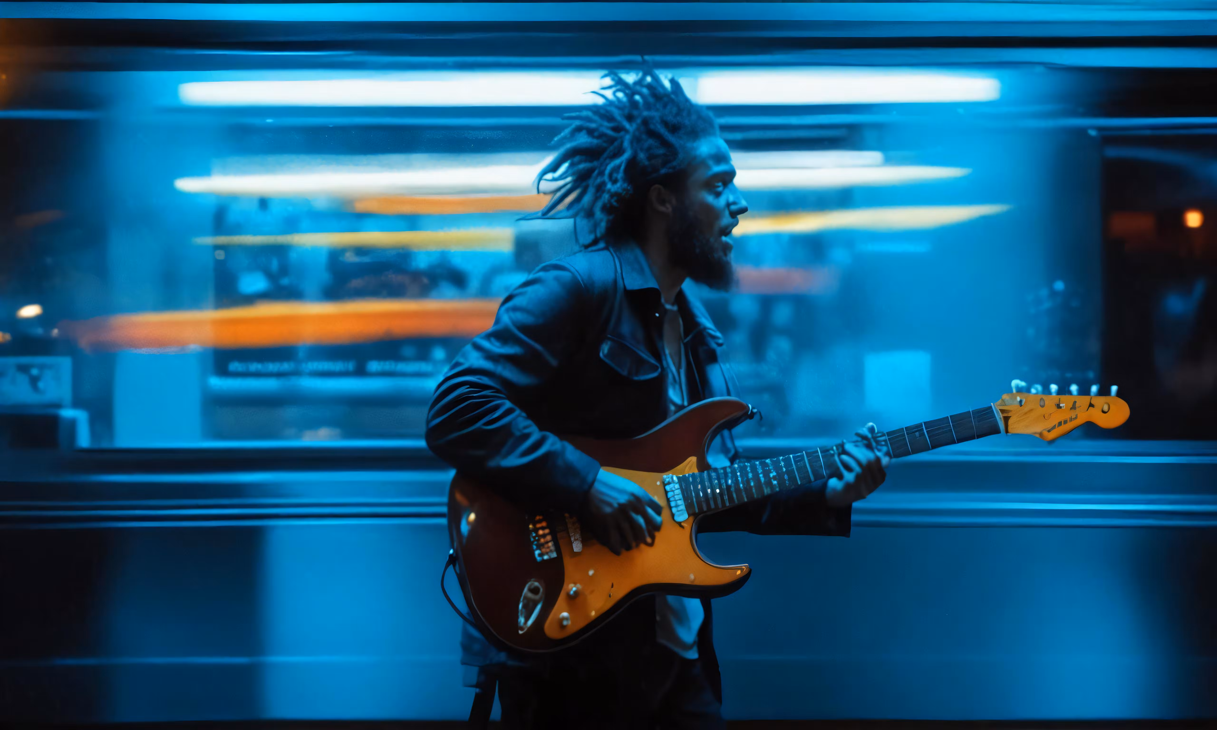 High resolution picture, free to use, a man with dreadlocks playing a yellow electric guitar