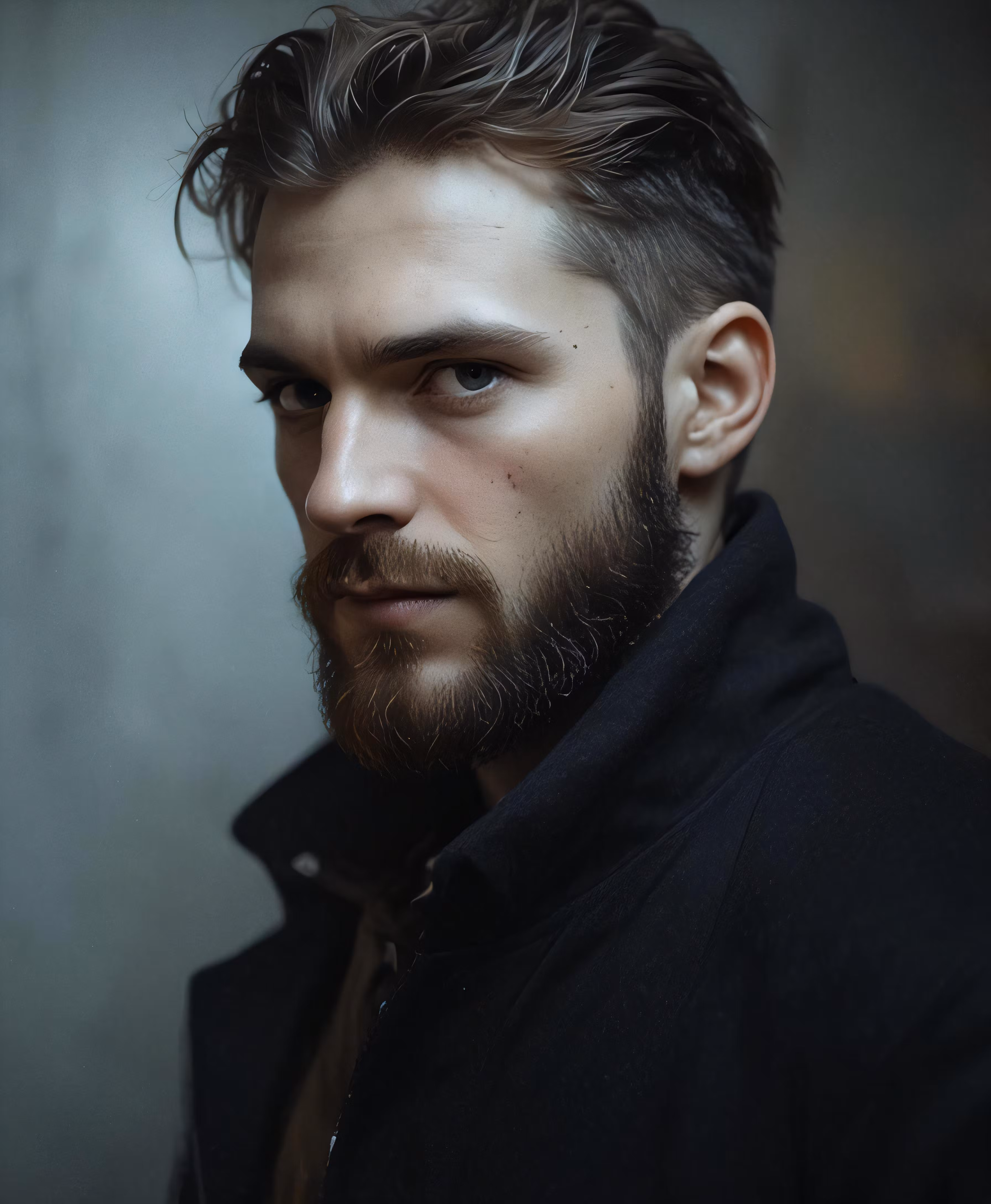 High resolution picture, free to use, a man with long hair and beard stares straight ahead