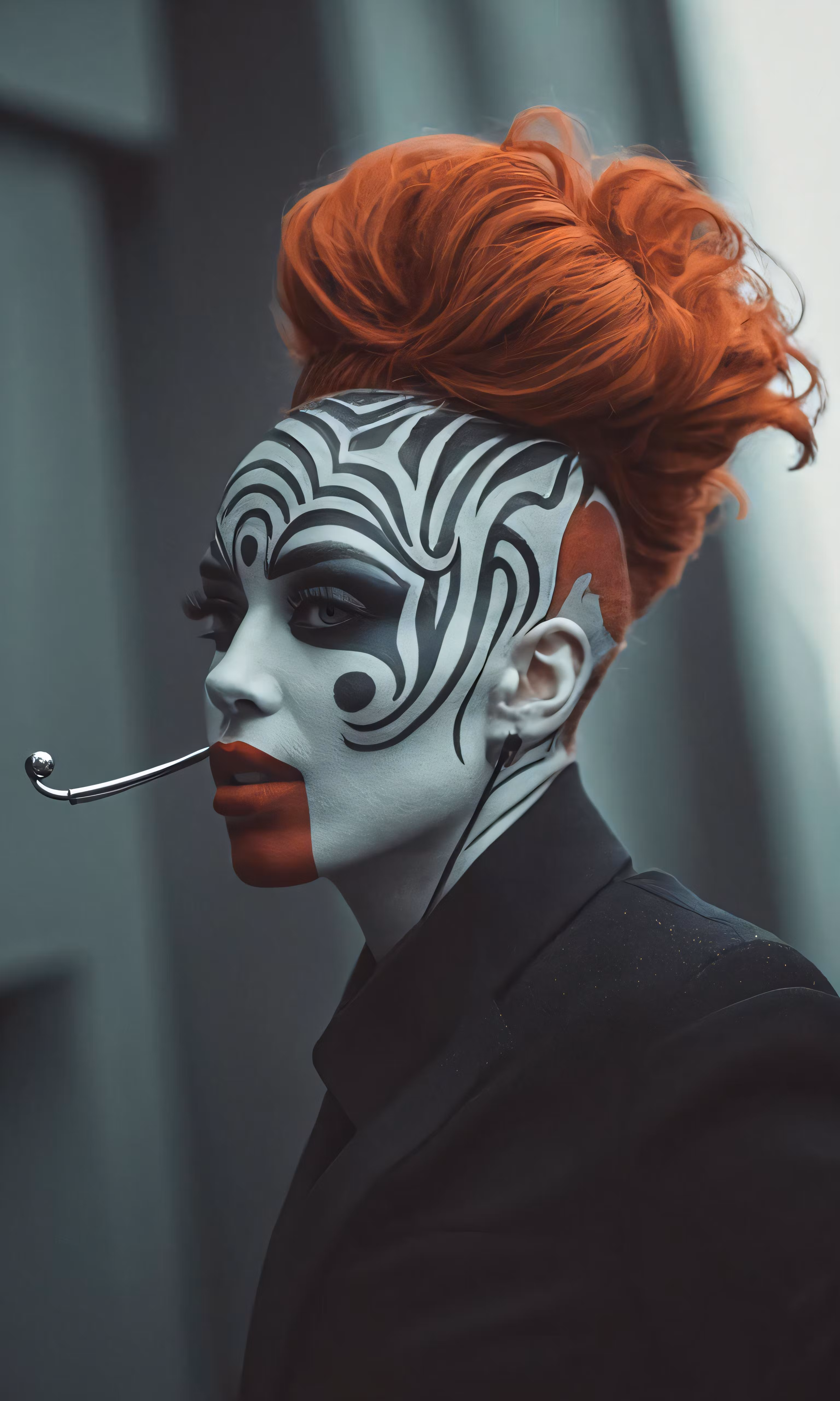 High resolution picture, free to use, a man with long red hair is wearing face paint