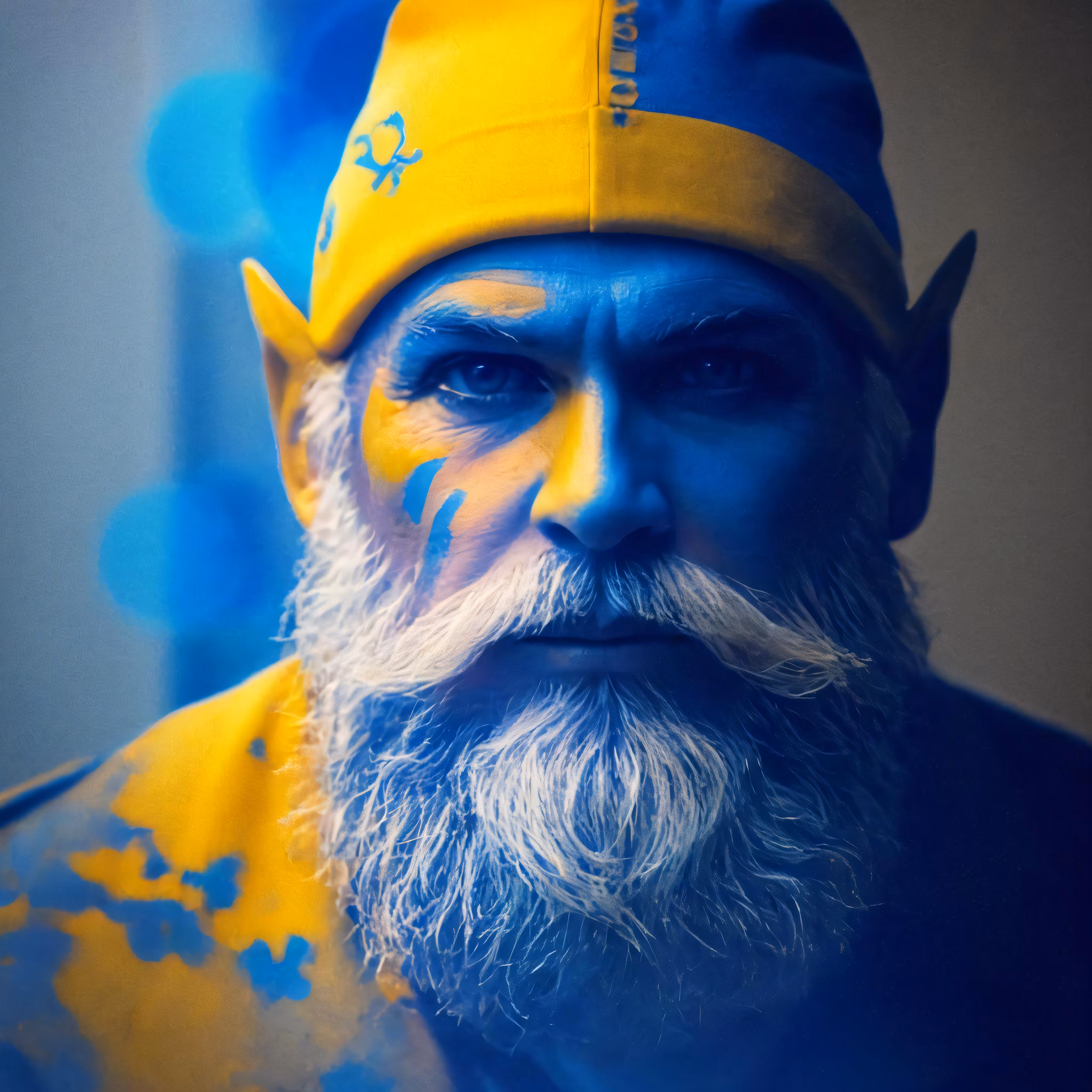 High resolution picture, free to use, a man with long white beard and a yellow cap wearing a blue hat