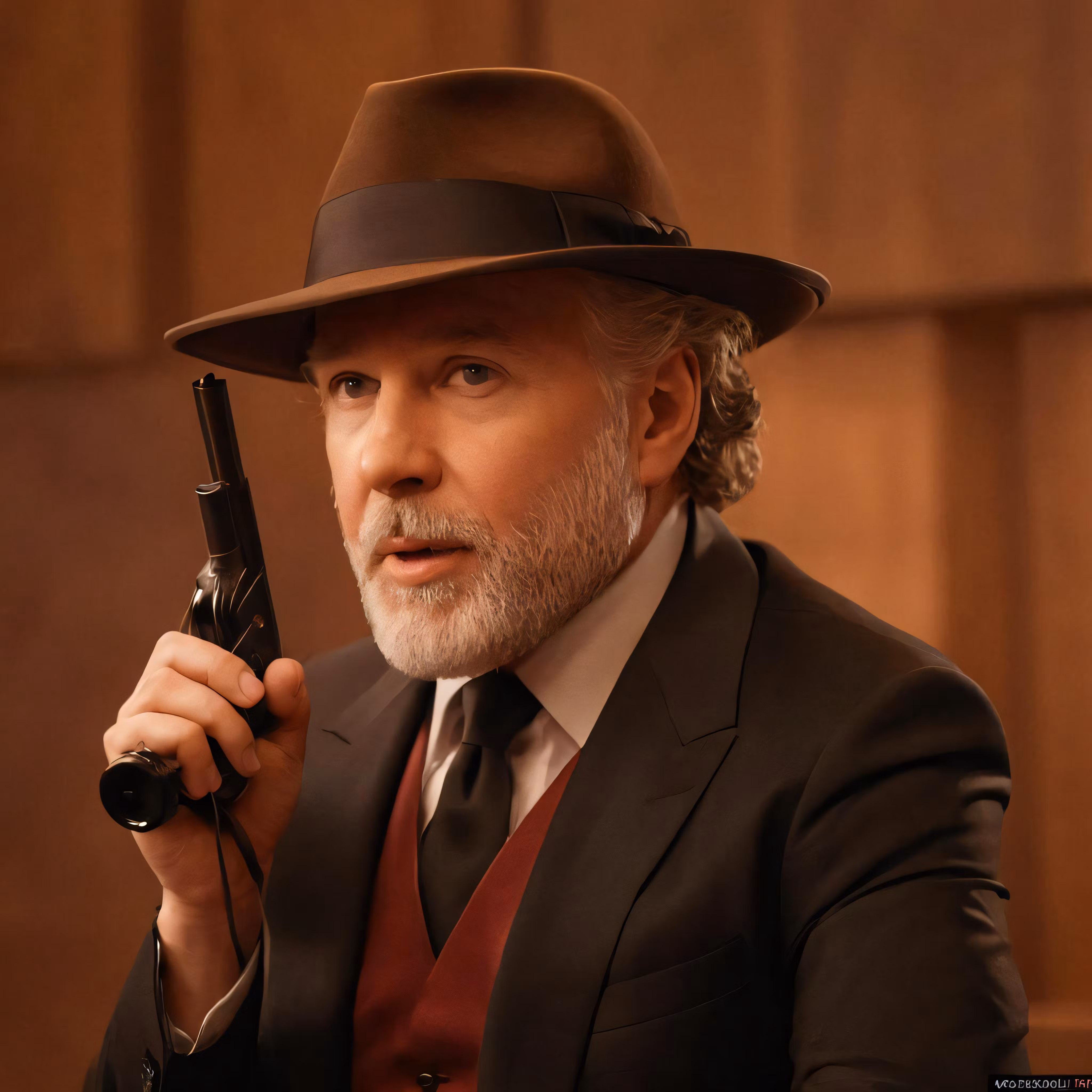 High resolution picture, free to use, a man with long white hair in a suit and tie holds a gun