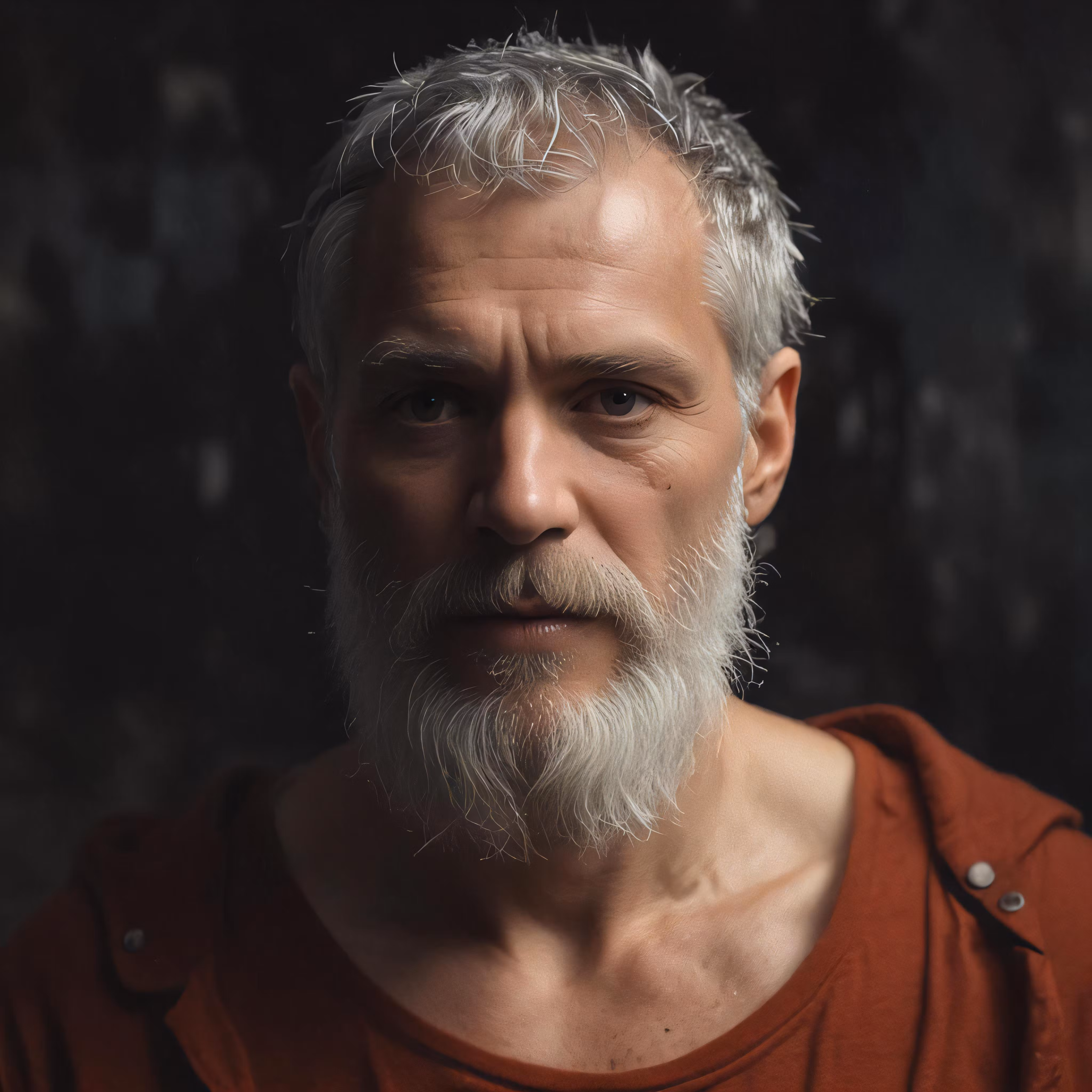 High resolution picture, free to use, a man with white hair and a beard stares into the camera