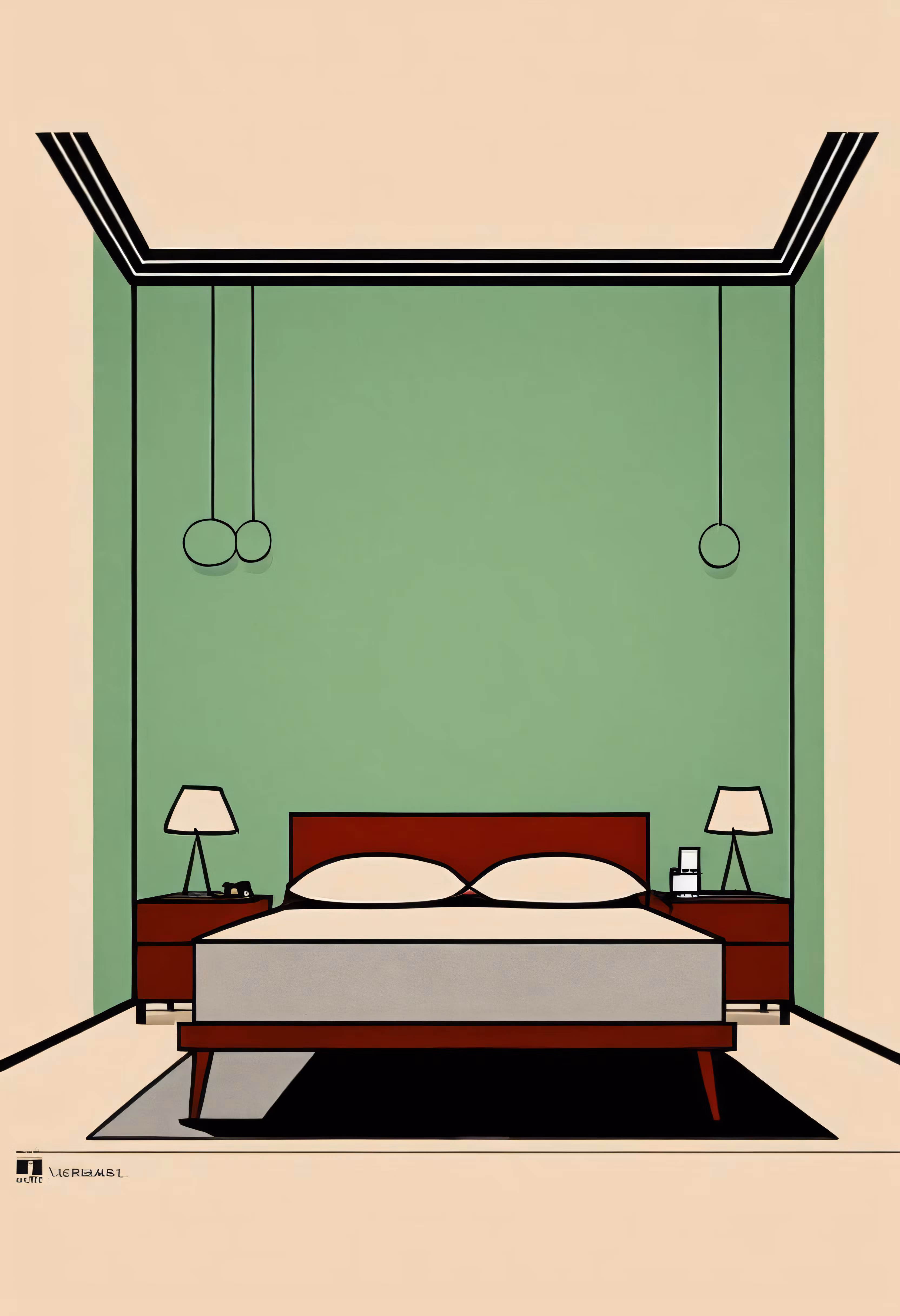 High resolution picture, free to use, a minimalist bedroom with a bed, two lamps and a green wall