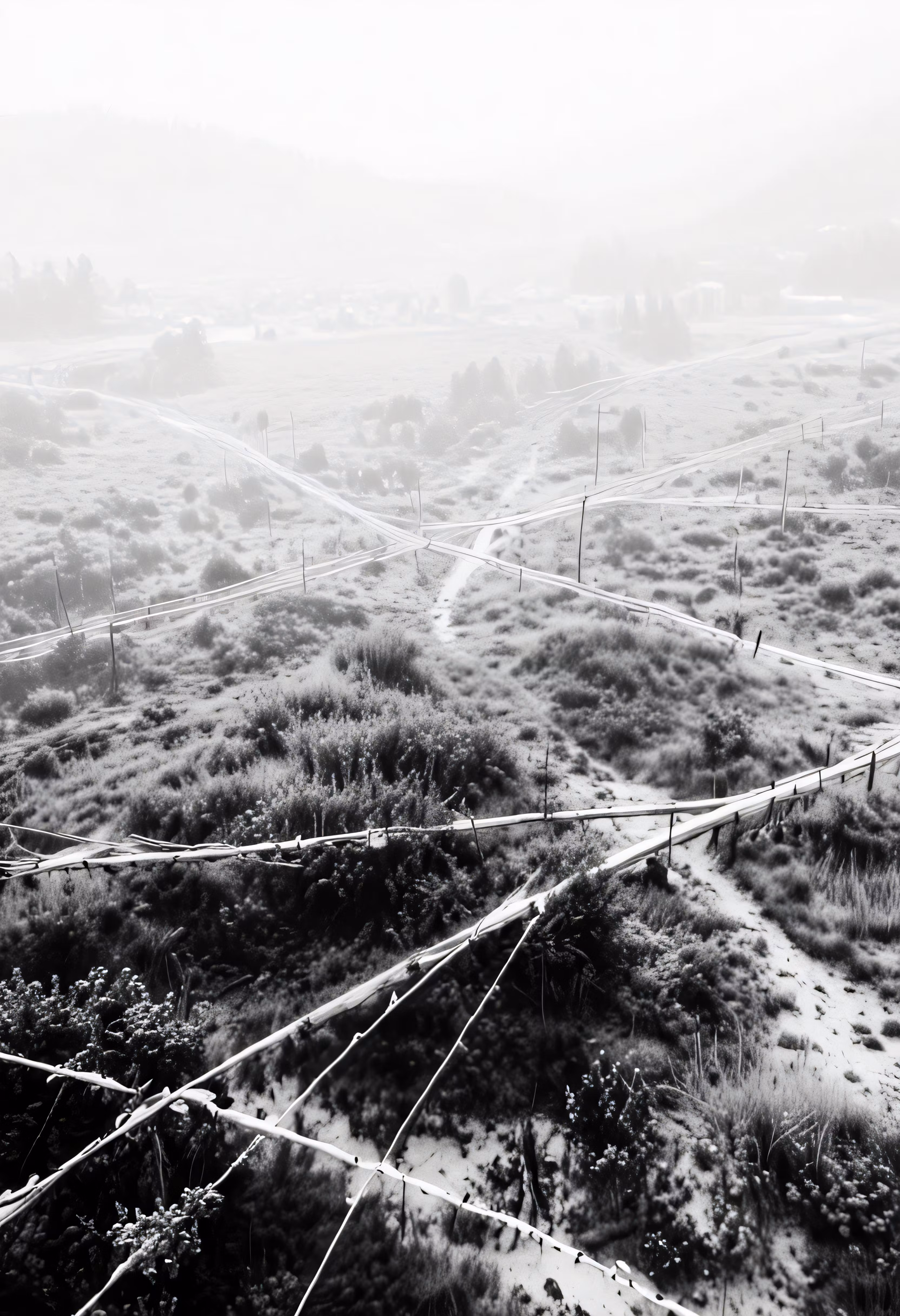 High resolution picture, free to use, a misty landscape with many road signs on the right side