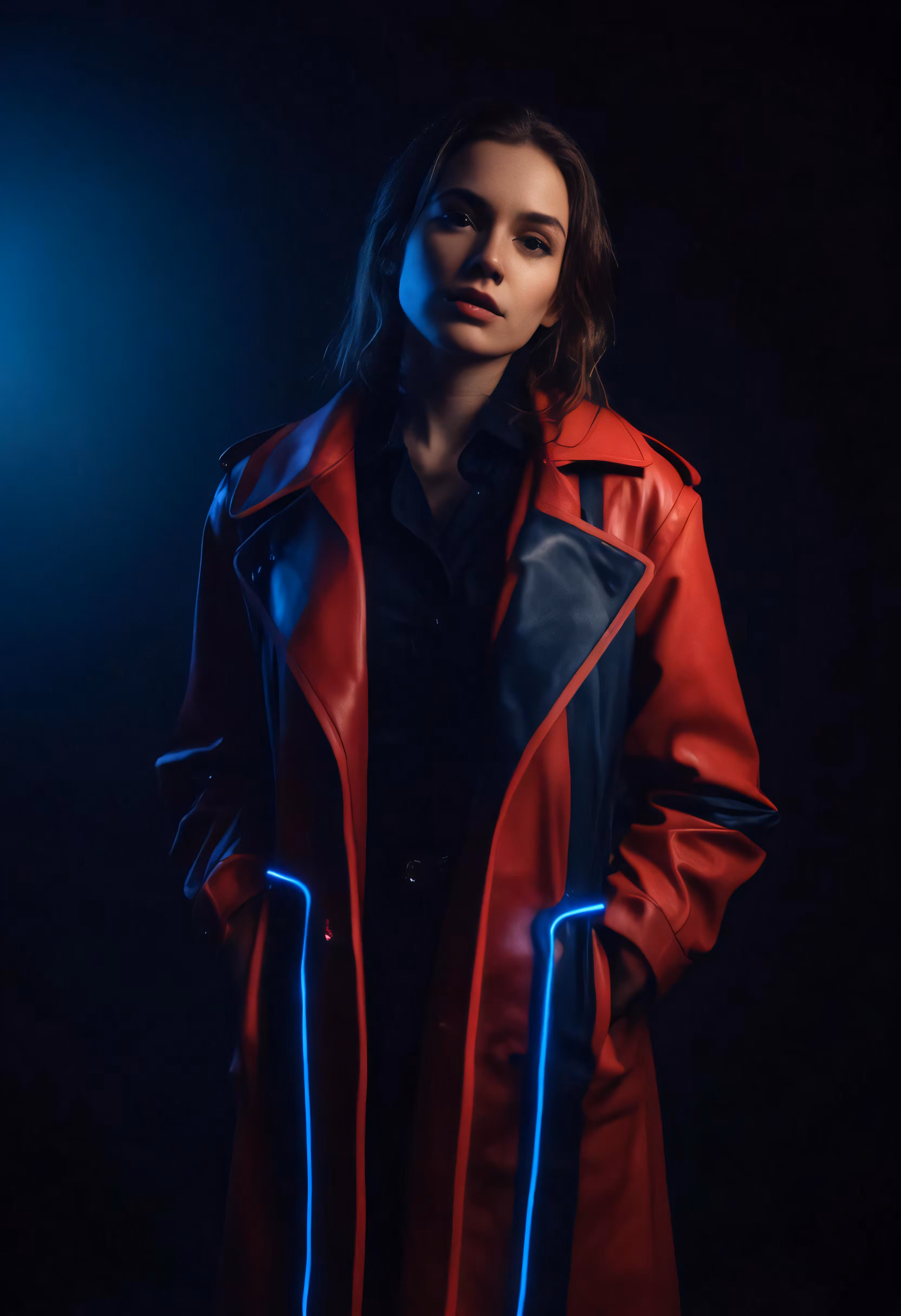 High resolution picture, free to use, a model is photographed in a red and blue coat