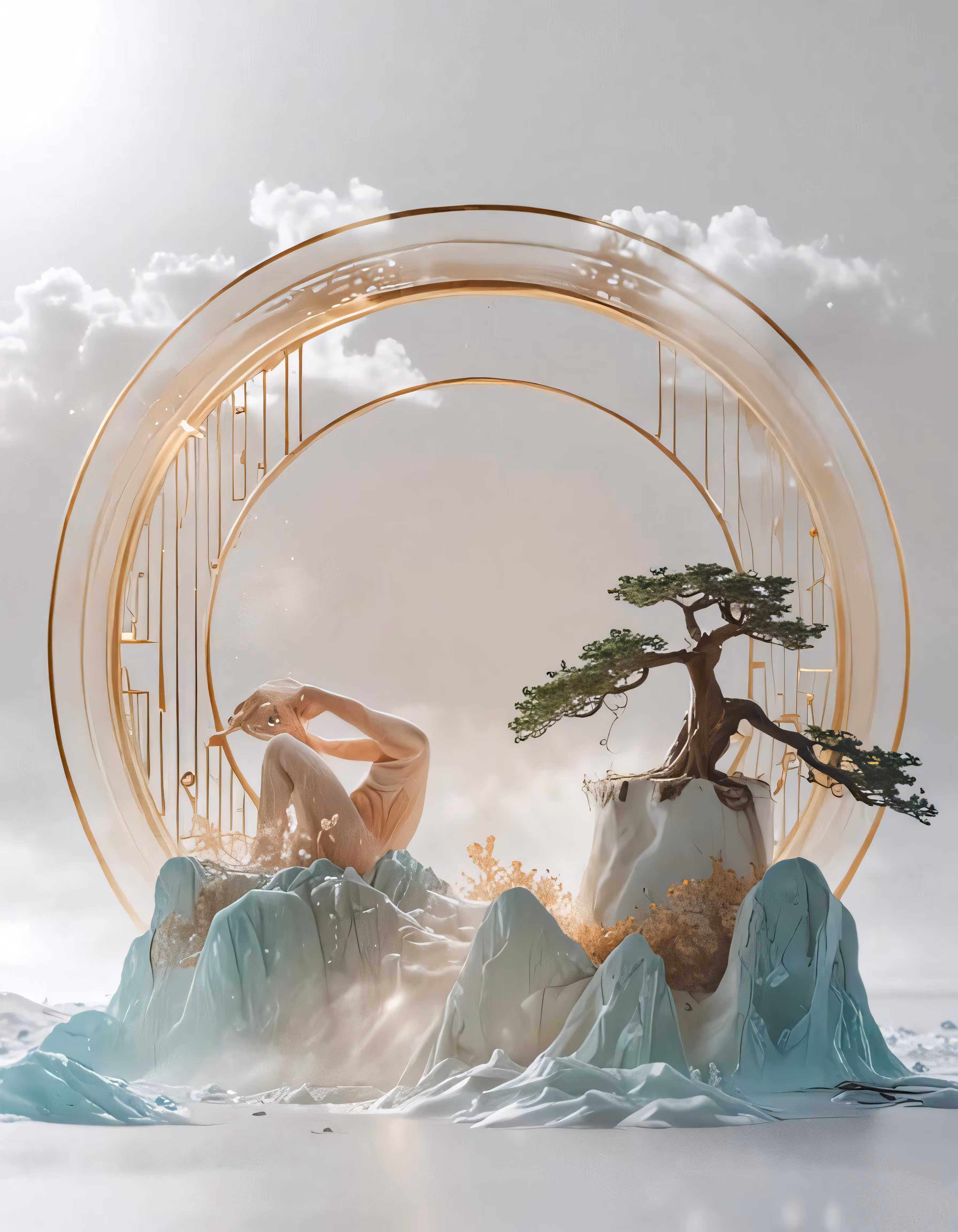 High resolution picture, free to use, a model sitting on a rock in a surreal photo