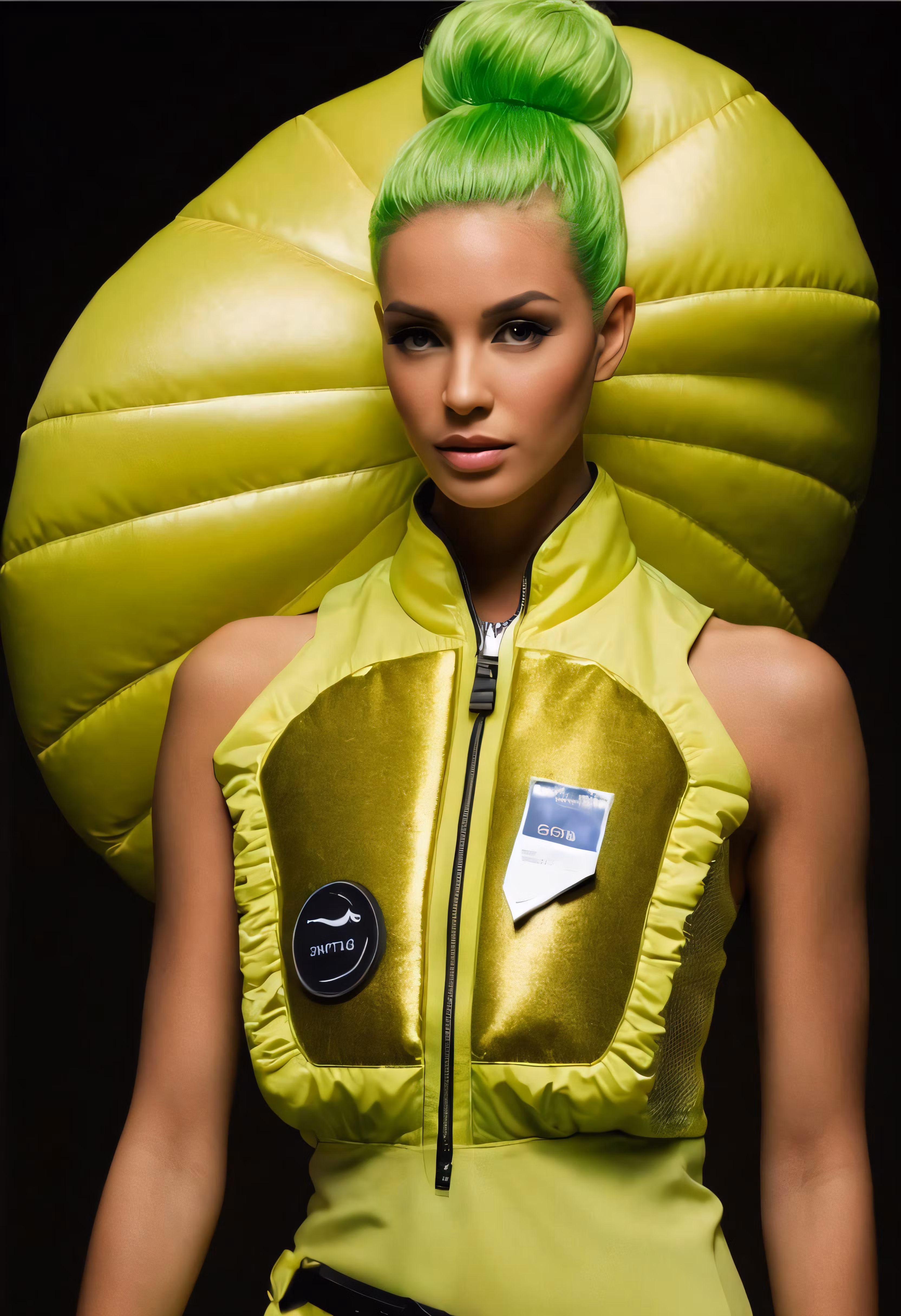 High resolution picture, free to use, a model wearing a green jacket and a yellow dress