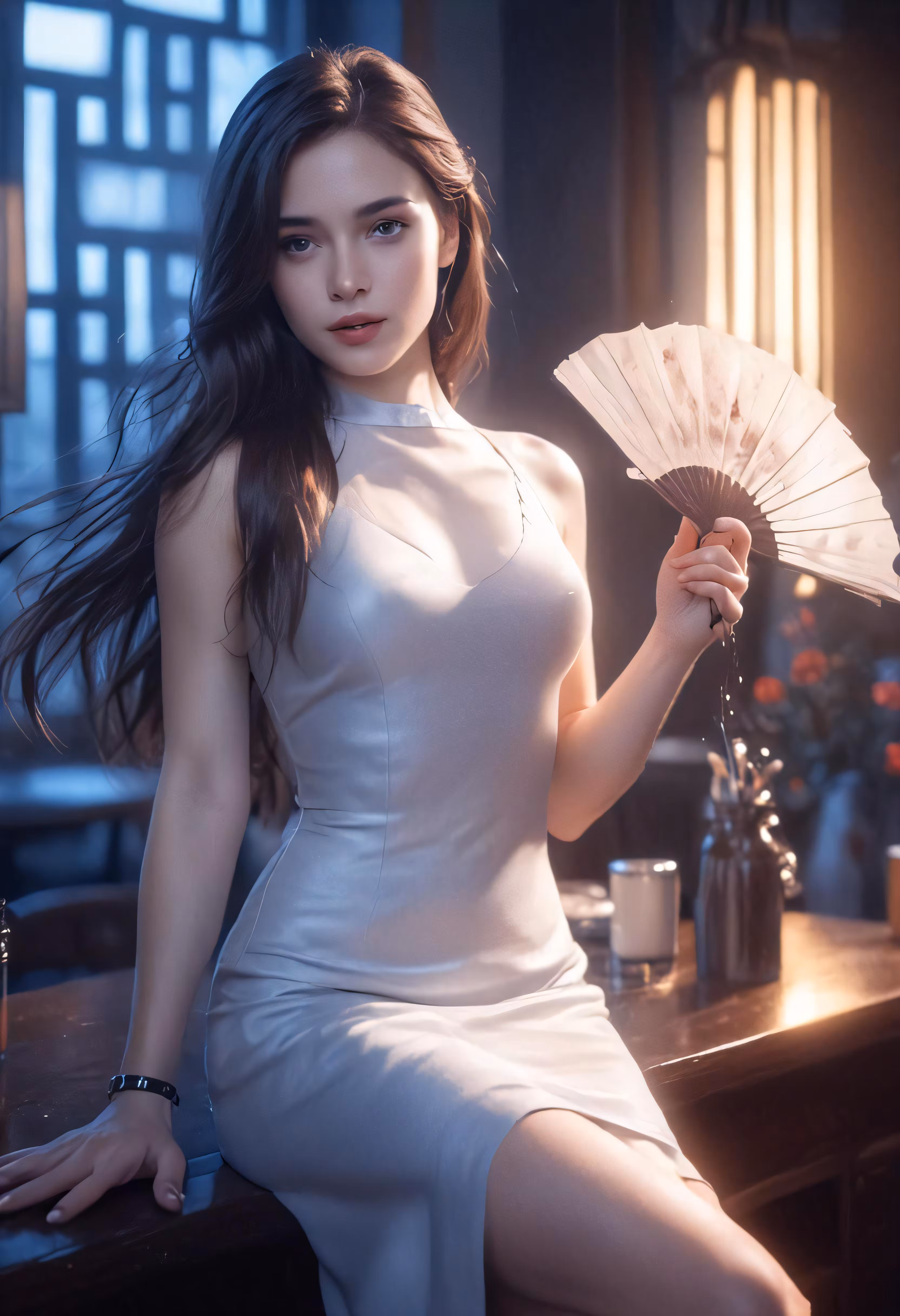 High resolution picture, free to use, a model with an asian   american appearance poses holding an oriental fan