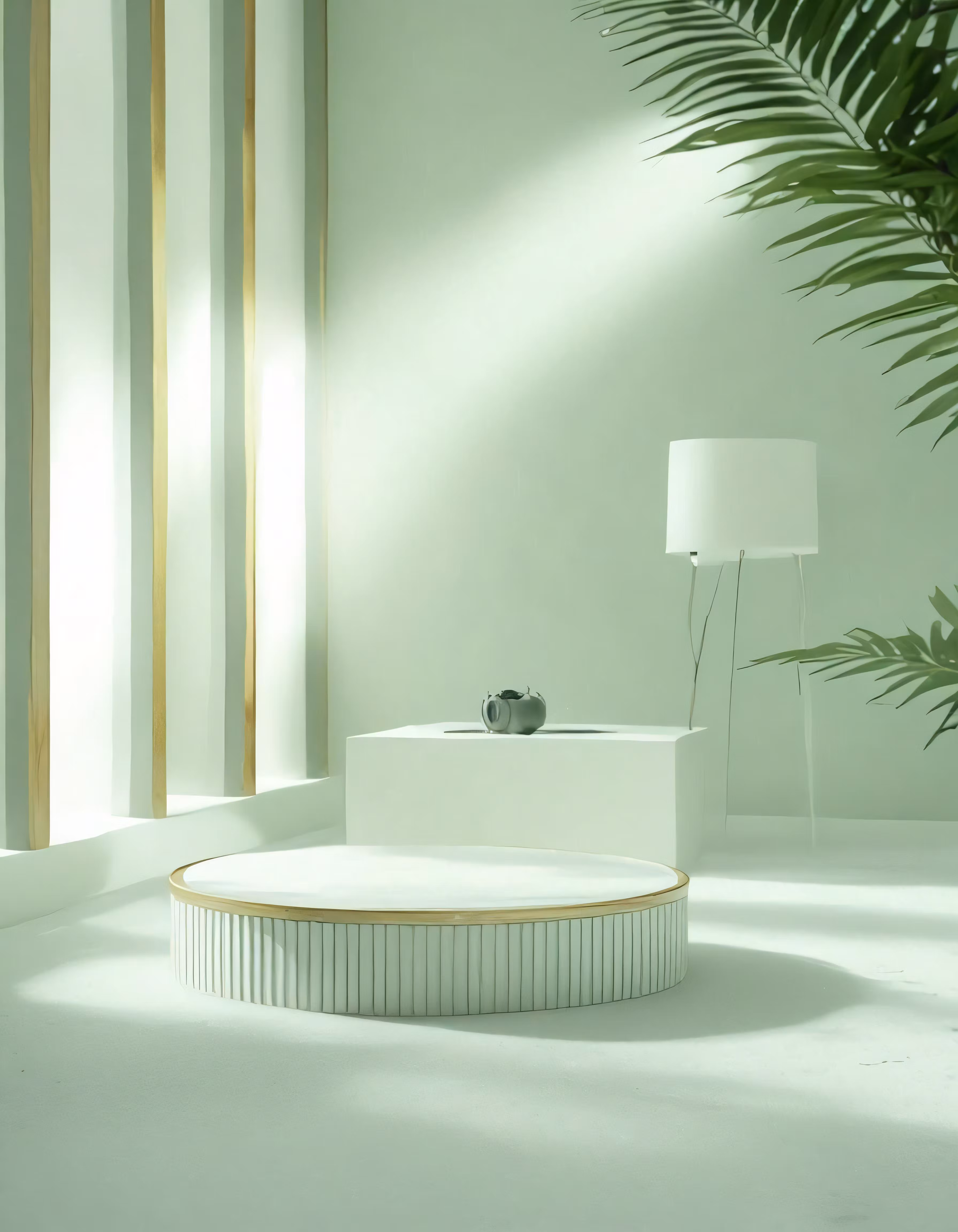 High resolution picture, free to use, a modern circular white table in a large white room