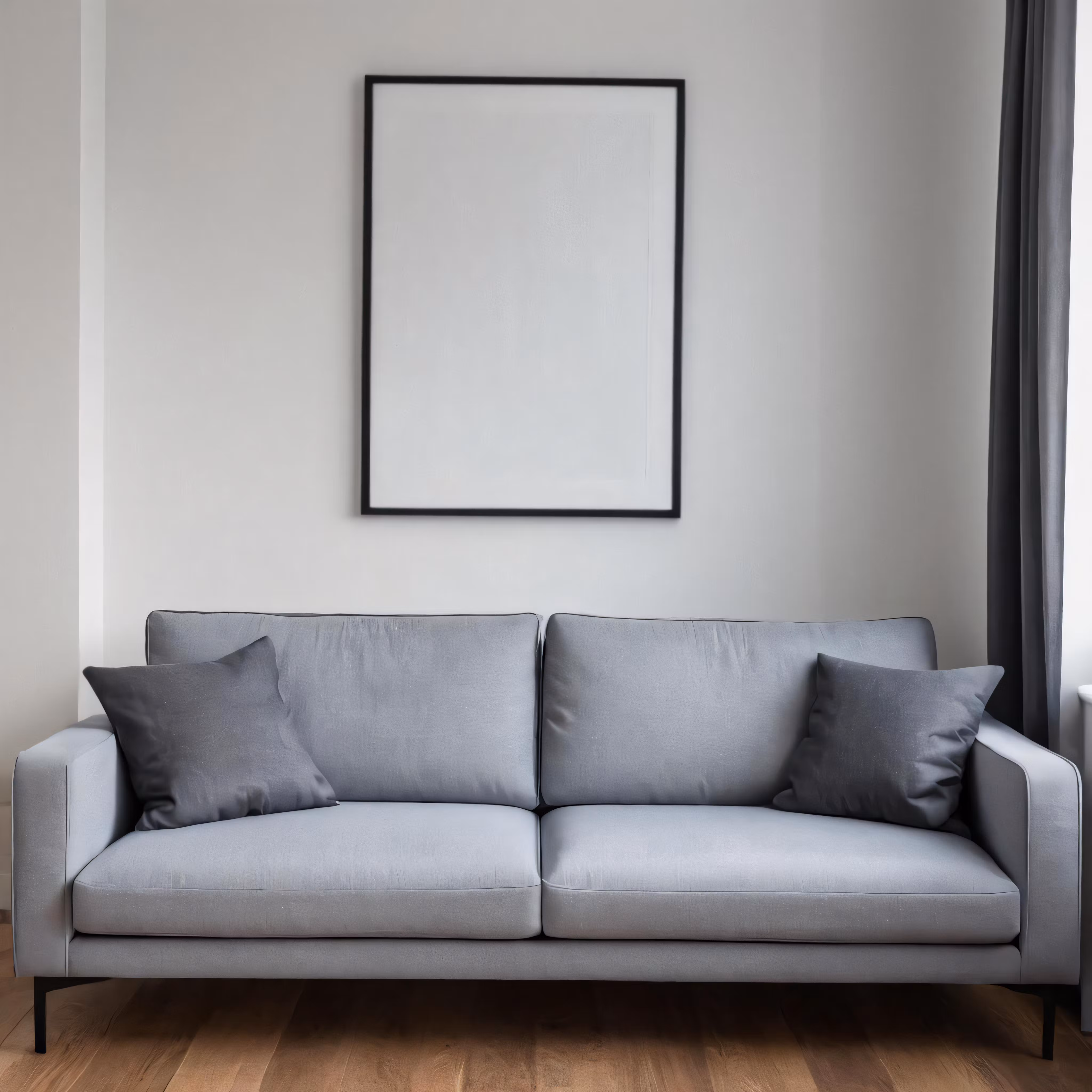 High resolution picture, free to use, a modern grey couch with blank paper hanging on the wall