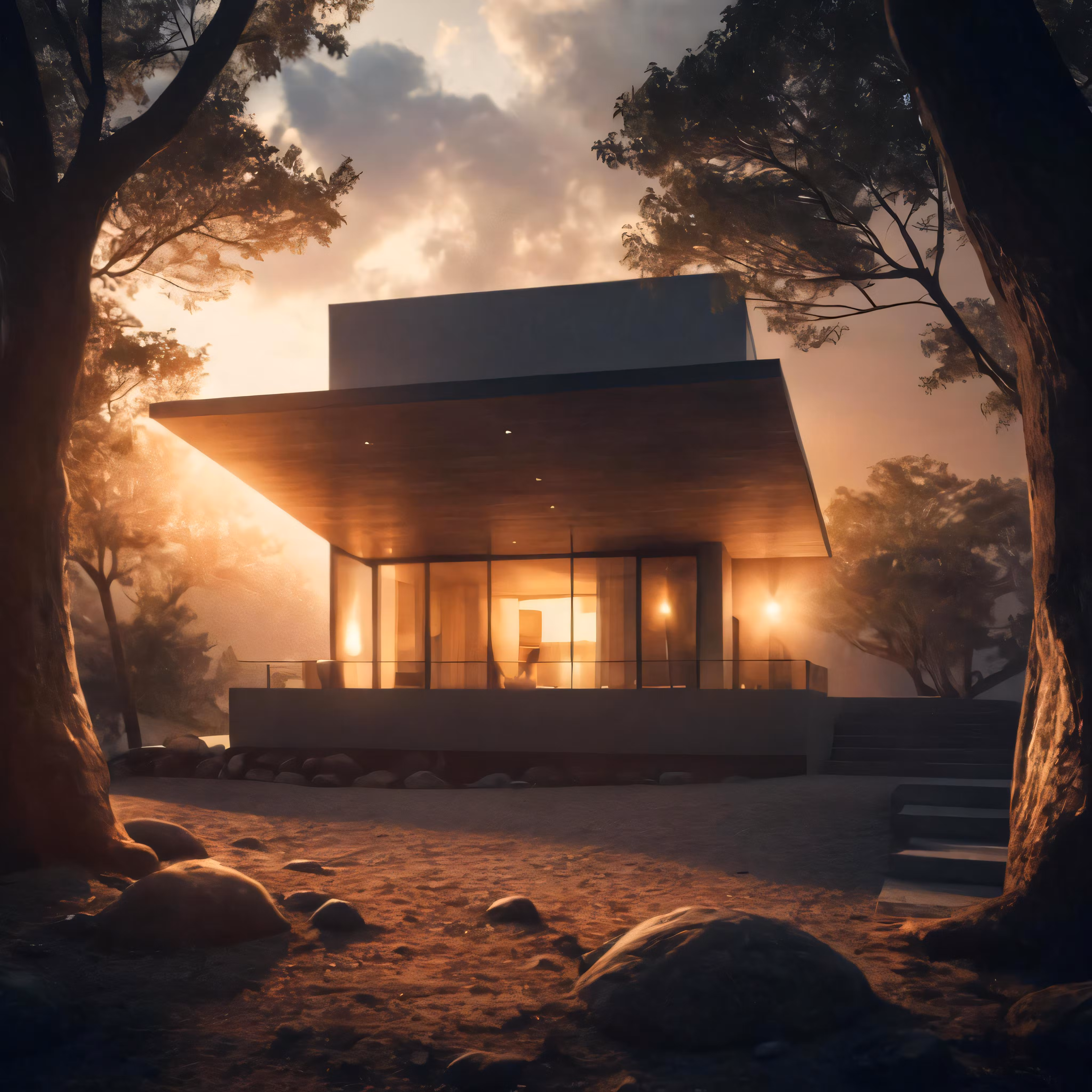 High resolution picture, free to use, a modern home surrounded by trees and mountains