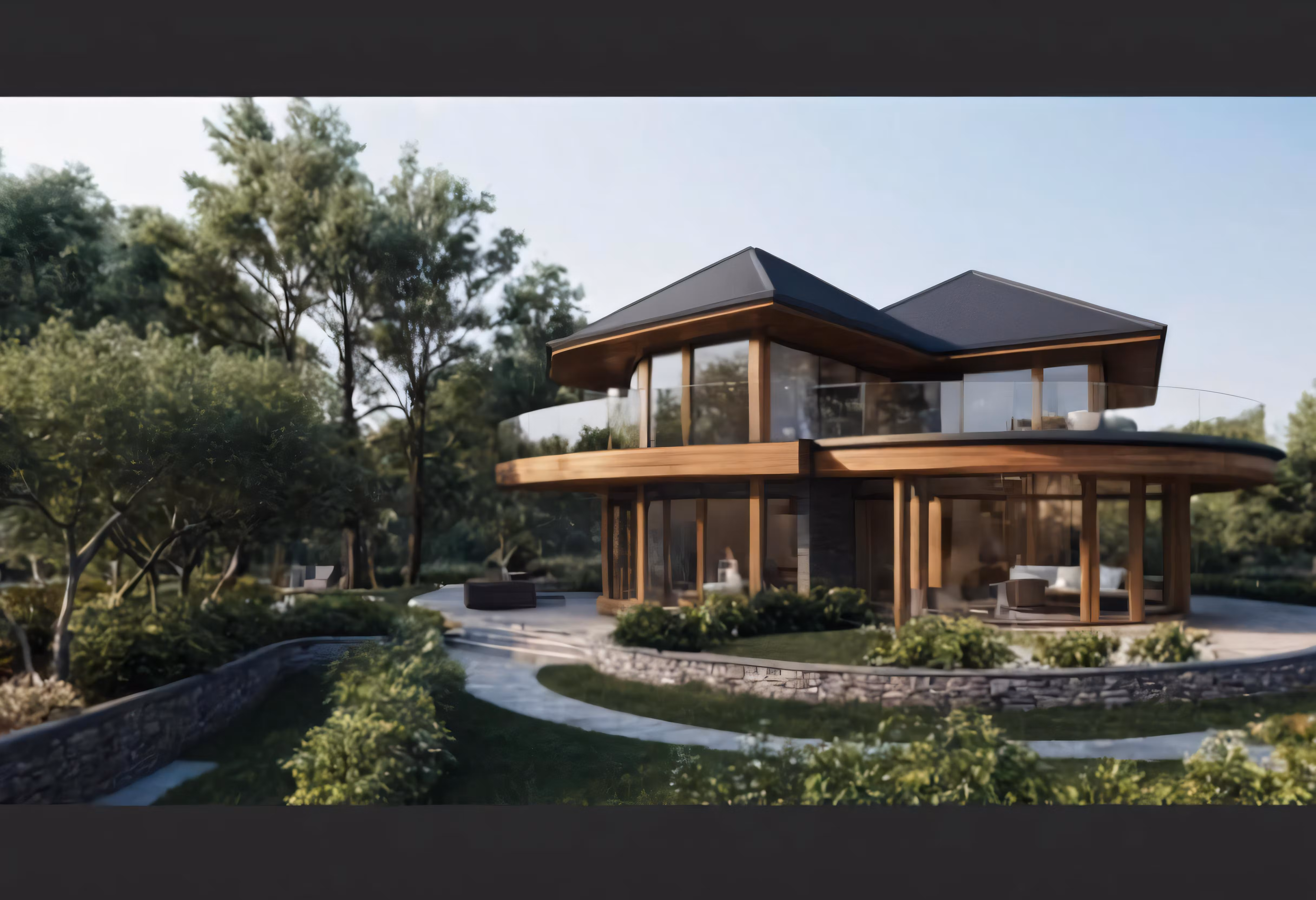 High resolution picture, free to use, a modern home that is surrounded by trees