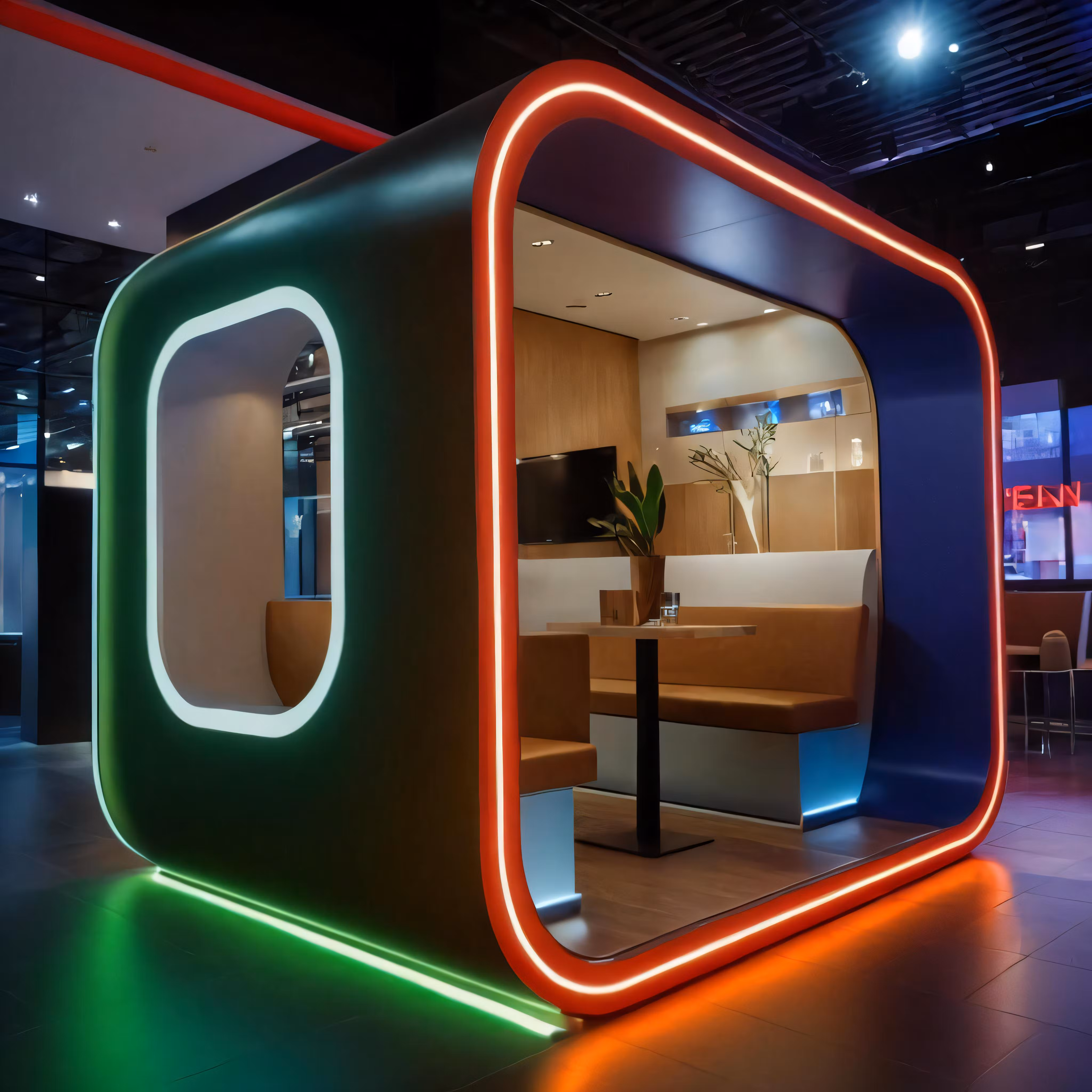 High resolution picture, free to use, a modern looking display room that has a neon green and red